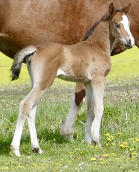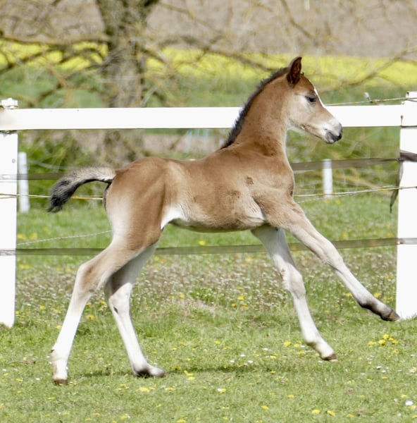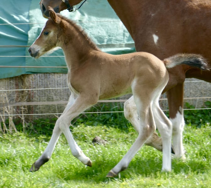 Clarissa Zora A ist ein außergewöhnliches Stutfohlen, das schon jetzt mit Ausstrahlung, Qualität und bester Genetik begeistert. Sie vereint in ihrem Pedigree einige der erfolgreichsten und einflussreichsten Springblutlinien Europas und bringt damit alles mit, was man sich für eine vielversprechende Zukunft im Springsport wünscht. Väterlicherseits stammt Clarissa Zora A von Cadiz ab, gezogen aus einer hochkarätigen Linie über Cordess, Clinton, Heartbreaker, Shakespeare bis hin zu Potsdam NRW. Diese bewährte Kombination steht für Vermögen, Vorsicht am Sprung und eine ausgezeichnete Rittigkeit. Mütterlicherseits bringt der Einfluss von Zinedine eine ganz besondere Qualität in die Anpaarung. Zinedine war eines der Erfolgspferde von Ludger Beerbaum und überzeugte auf internationalem Parkett mit beeindruckender Leistungsbereitschaft und Konstanz. Besonders geschätzt wird er für die Weitergabe von nahezu grenzenlosem Springvermögen, großer Übersicht am Sprung und außergewöhnlicher Qualität im Parcours. Er entstammt ebenfalls aus der bewährten Heartbreaker-Linie. Clarissa Zora A selbst präsentiert sich als bezauberndes, typvolles Fohlen mit viel Ausdruck und Charme. Ihre Bewegungen sind elastisch und schwungvoll, ihr Auftreten aufmerksam und selbstbewusst – Eigenschaften, die ihr zukünftiges Potenzial bereits jetzt erahnen lassen. Mit dieser hochkarätigen Abstammung und ihrem vielversprechenden Gesamtbild bringt Clarissa Zora A beste Voraussetzungen für eine erfolgreiche Zukunft im Springsport und der Vielseitigkeit mit.