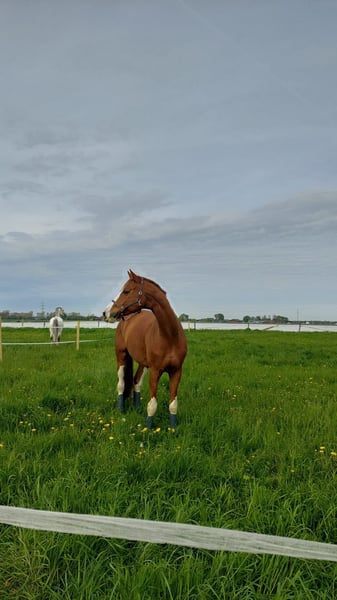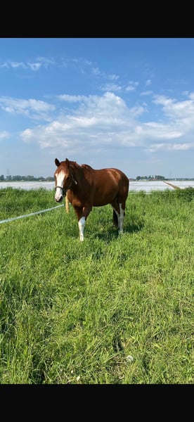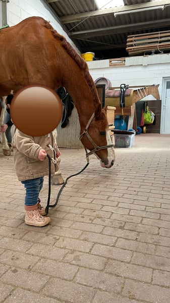 Milky (Full of Colour) – Loyal Gelding with a Gentle Heart and Golden Character Seeking a Loving Home Our beautiful chestnut gelding, Milky (Full of Colour), will turn 12 years old this year and has an approximate height of 180 cm (about 14.1 hh). With his striking white legs and his sweet, almost foal-like head, he immediately captures everyone's attention. Milky has been in our possession for six years and has become an absolutely reliable and loyal companion during this time. He has extensive experience in vaulting and has always impressed with his calmness and composure. His gentle nature with children is especially noteworthy – he has been handled, groomed, and cared for by children of all ages in our care. He enjoys hacking out, always remains well-behaved and balanced, and adapts easily to any herd. He tends to be lower in the social hierarchy and is completely compatible with other horses – a true gentleman in his dealings. Currently, Milky is not suitable for sport due to a tendon injury. However, with sufficient time, patience, and proper care, there is potential for him to regain his fitness. We are happy to discuss this in more detail during a personal conversation. We are therefore looking for a loving home for him – ideally initially as a companion horse – where he can receive the necessary time to heal and continue to be cared for. If you are searching for a friendly, child-loving, and social horse with a very special character, Milky will be a loyal companion for life. We look forward to receiving your message if you are interested!