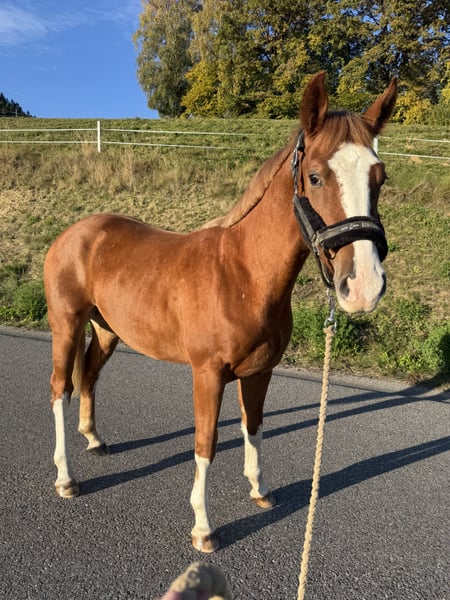 Schweren Herzens würde ich, nur wenn alles past, aus privaten Gründen, für diesen süßen Kerl einen neuen Platz suchen. Der Wallach ist ein Dezemberkind aus dem Jahr 2023 und optisch sowie charakterlich ein echter Schatz ! Er ist gesund und hat keinerlei Unarten. Er genießt es wenn man Zeit mit ihm verbringt, lässt sich problemlos überall anfassen, gibt alle 4 Hufe, kennt Hufschmied sowie Tierarzt, Hängerfahren ist ihm bekannt, lässt sich von Kopf bis Fuß ohne probleme Waschen, lernte schon spielerisch jegliches Reitzubehör kennen und dackelt beim spazieren hinterher wie ein kleiner Schoßhund. Er lebt seit seinen ersten Tagen im Offenstall, weswegen er sehr robust aufwuchs und ist definitiv Herdenverträglich. Eine Zukunft als Freizeitpferd, braves Familienmitglied oder auch als Sportpferd in jeglichen Sparten steht ihm noch offen. bei Interesse einfach Kontakt aufnehmen ☺️