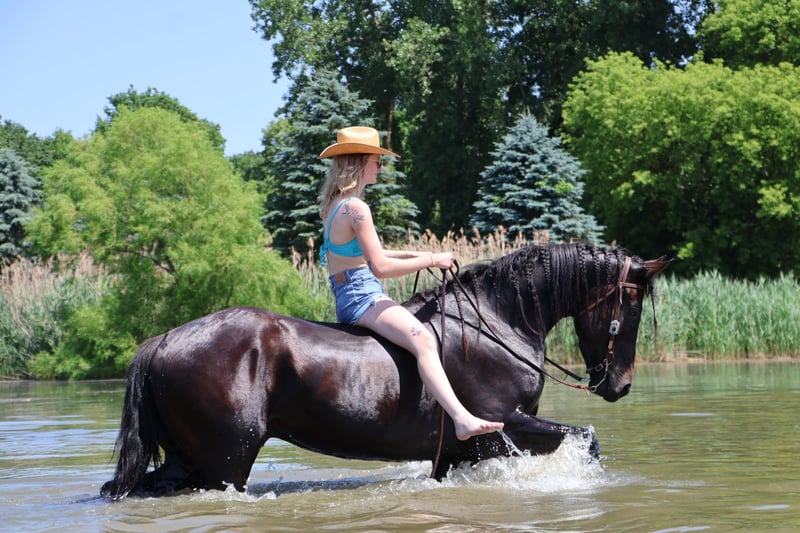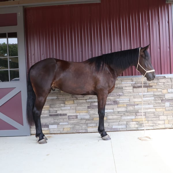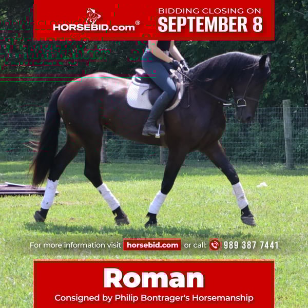 ♦️ 𝐭𝐡𝐞 𝐒𝐞𝐩𝐭𝐞𝐦𝐛𝐞𝐫 𝑺𝒆𝒍𝒆𝒄𝒕 ♦️ Happening now thru MONDAY | SEPTEMBER 8th - Available EXCLUSIVELY on HorseBid's website! For more details and to register visit: www.Horsebid.com CONSIGNOR CONTACT: Philip Bontrager's Horsemanship. 989 387 7441 LOCATION: Howell, MI BREED: Warmblood REGISTERED: No COLOR: Black HEIGHT: 17.1 AGE: 4 GENDER: Gelding Meet Roman!! He is a 4 year old black Warmblood gelding standing @17.1hh and absolutely gorgeous. Roman rides english and western. He rides very good on the trail and on the road. He is traffic safe..whether you want to ride down an old country road or on the highway. He also rides 100% in the arena indoor and outdoor and does lots of maneuvers. He is very soft and supple in his poll and moves with lots of suspension and animation in all three gaits. Roman has 3 very smooth gaits- walk, trot, and canter. He lopes circles, neck reins, and moves off of leg pressure perfectly. You won't ride a softer horse. He takes both leads wonderfully and does flying lead changes as well. He loads, clips, bathes, and stands great for the farrier. I have also used Roman to rope colts, he performs it all with ease. Roman is a 10/10, he goes through water, over logs and he rides good by himself and with other horses. Whether you want a horse to trail ride for hours, dressage, hunter jumper, or just a friendly family horse, Roman is your guy! He is very friendly and will meet you at the gate any time of the day. Absolutely no buck. His english riding is phenomenal. His jumping is wonderful- and he loves doing it. Take him around a hunter course or over logs out in the field and he'll take you right to the other side. He is very athletic and rides exceptionally well for his age. Roman has been through a very successful training program and is ready to go in any direction. If you want a sport horse with exceptional movement or a horse to enjoy on the trail, then Roman is your horse. He really enjoys going on a relaxed trail ride. Roman is the horse everybody wants but nobody can find. Roman has also been ridden by many different level riders. You will see him ridden by many different riders in his video. For more info on this stunning horse, please call 989 387 7441 to schedule a visit. You don't want to miss this one!