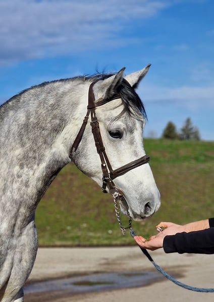 ♣️♠️ Poker ♠️♣️ ♣️ Gelding ♣️ 5 years old ♣️ 1.60 m Poker is a graceful gelding with a calm temperament that immediately inspires trust. He is easy to handle, people-oriented, and enjoys working with his rider, always remaining respectful and attentive. Whether in the riding arena or out on the trail, he stays calm and reliable. He also keeps his composure in traffic, providing a sense of security for his rider. He has already mastered small jumps. In daily handling, he is straightforward: grooming, farrier visits, or tacking up are no problem for him. He gets along well with other horses, adapts easily to a herd, and is neither dominant nor insecure. He also behaves cooperatively when loading and in new environments. Health. Poker is a true partner for everyday life – confident, calm, and lovable, someone you can always rely on. +49 176 4017 7894
