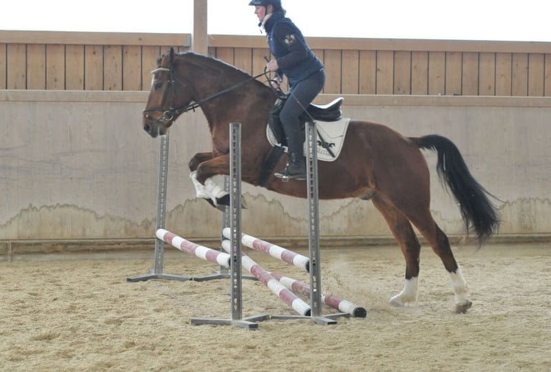 Dieser hübsche 5-jährige Wallach vom bekannten Vererber Acorado, Vater Aromats, überzeugt mit drei guten GGA und sehr viel Talent am Sprung sowie toller Einstellung. Äußerst bequem zu sitzen vermittelt er ein wunderbares Reitgefühl. Er kennt das Training auf den Äußenplätzen sowie in der Halle. Dressurmäßig auf dem Weg zu E und A-Niveau eignet er sich auch für unerfahrene Reiter. Durch seine Größe auch für Damen und Junioren geeignet. Auch für Geländeausritte ist er immer zu haben.