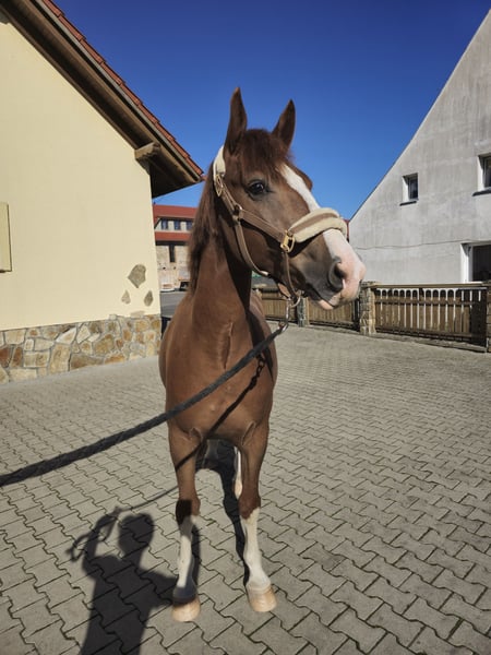Schön gezeichneter, kleiner Warmblutpferd zum Verkauf. Ca. 155 cm Stockmaß, edler Typ. Mutter: Iskierka Wlkp nach Faust OO Vater: Kaleń Śl. nach Lombard Śl. Geboren 2019. Ich habe ihn gekauft, als er 1,5 Jahre alt war, und seitdem ist er in meiner Obhut. Sein Ausbildungsstand ist als vorerst eingeritten mit Problemen, die noch bearbeitet werden müssen. Er wurde von Anfang an auf die Grundausbildung trainiert. Mit drei Jahren begann die Arbeit mit Sattel und Longe, er nahm den Reiter mit stoischer Ruhe auf, es gab keine Probleme beim ersten Aufsteigen und Reiten. Seit einiger Zeit zeigt er jedoch Schwierigkeiten mit dem Reiter auf dem Rücken, als hätte er Angst davor. Er ist sehr sensibel und freundlich, ruhig bei Pflege und Hufschmied, mag Wasser und Sprühflaschen nicht, aber bei systematischer Arbeit gewöhnt er sich schnell daran. Von seinen Vorfahren hat er die besten Eigenschaften geerbt: kräftige, harmonische Konstitution, gerade, gesunde Beine, starke Hufe, widerstandsfähig gegenüber Witterungseinflüssen, nicht dicker, keine Krankheiten, nie verletzt. Er nutzt jede Futterration sehr gut (was sich in Übergewicht zeigt). Er wird von morgens bis abends in der Herde auf der Weide gehalten, im Sommer auch nachts. Im Herdenverband ist er nicht dominant, lässt sich aber nicht alles gefallen. Geimpft, entwurmt und regelmäßig entwurfsystematisch behandelt. Der Pferd frisst nur nach der Mahlzeit, eine Gastroskopie wurde nicht durchgeführt. Er zeigt keine Schmerzen oder Anzeichen von Magengeschwüren. Es könnte eine Gewohnheit nach dem Fressen sein, da er als 2,5-jähriger Hengst während der Abwesenheit der Stallbesitzerin in einer Box gehalten werden musste. Niederschlesien, Jelenia Góra