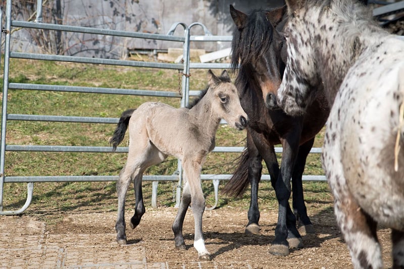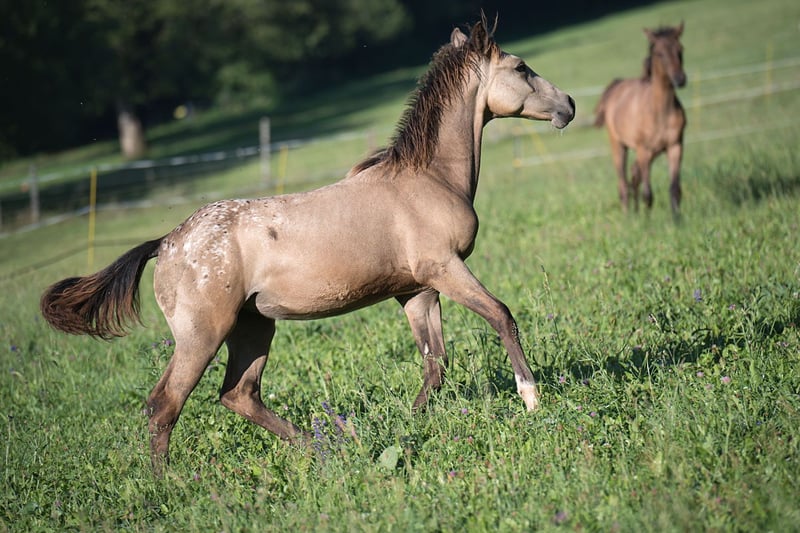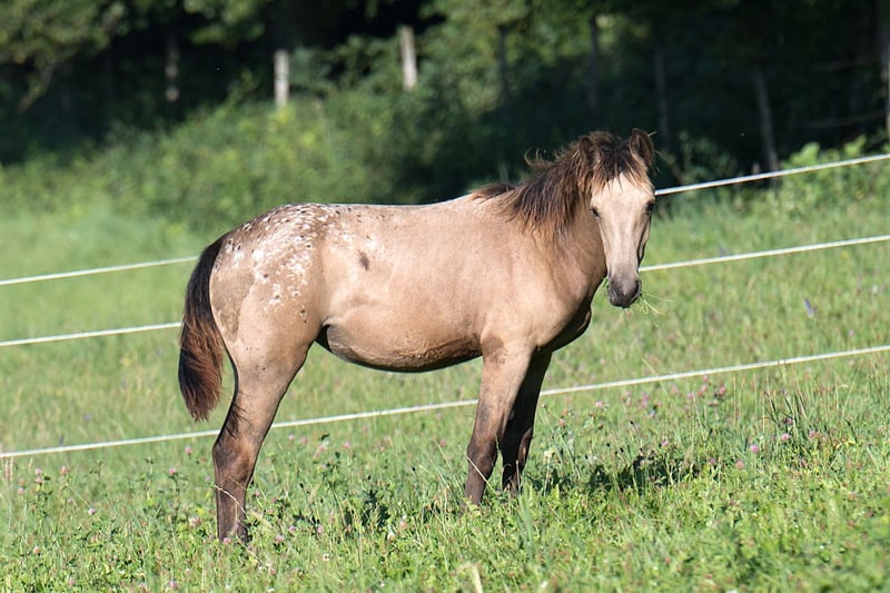 , sociable and with plenty of "gait" — she regularly displays a smooth gait in the pasture — and additionally in the highly sought-after, rare color BUCKSKIN! Nuna is a healthy, top-fit, perfectly conformed gaited horse resulting from the cross between Pataha (Foundation Appaloosa) and Ayita (Rocky Mountain Horse). She carries a copy of the DMRT3 gait gene, which means she has a genetic predisposition for gaited movement (Tölt/Rack). She has full, regular papers issued by the Walkaloosa Horse Registry USA. Her 6-Panel test through her sire (Foundation Appaloosa) is negative, indicating she is not a grey (and will not grey out). Buckskin is not just a distinctive coat color. Historically, Buckskin horses are renowned for numerous outstanding qualities and strengths, which are believed to trace back to their genetic heritage from Spanish Sorraia horse lines around 1500. Buckskin horses are known as "hard workers." They are said to possess greater endurance, determination, very strong hooves (sometimes described as steel-shod), stronger bones, and generally to be tougher and more resilient than other horses. The phrase "tough as wet leather" aptly describes true Buckskins. Finally, they are also well-known for their attractive coloration, often seen in Western films. Additional photos can be viewed on the website of the Doublefoffestranch.