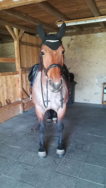 Nach reichlicher Überlegung und schweren Herzens haben wir uns entschlossen, wegen Umzug ein neues Zuhause für unsere schöne Stute zu suchen. Kaltblut-Mischlingsstute ' Sterni ' - Super schöne Stute mit grünem Pass - 12 Jahre alt - 165cm groß - Gesund, voll geimpft und regelmäßig zahnärztlich untersucht. - Super Temperament, lieb, ruhig und ohne jegliche Unarten. - Kein Treten, Beißen, Futterneid und hebt die Hufe gut. - Liebt den Kontakt mit Menschen und ist umgänglich mit allen Altersgruppen. - Reitet in allen 3 Gangarten. - Nie störrisch und immer willig. - Kann alleine Ausgeritten werden. - Perfekt für Freizeitreiten. - Sie ist seit 4 Jahren bei uns, wird im Gelände geritten und geht sicher auf der Strasse. - Sterni ist so zuverlässig, dass sie ohne Sattel und Zaumzeug geritten werden kann. - Geht an der Longe und ist an die Bodenarbeit gewöhnt. - Verladung auf einen Anhänger ist möglich. - Sterni hat ein wunderschönes Fell in Roan-Bay Farbton, und so wechselt das Fell zwischen den Jahreszeiten von weiß zu braun. - Sterni ist ein wenig verfressen und daher etwas übergewichtig. Wir haben sie deshalb auf ein entsprechendes Trainingsprogramm gesetzt. - Der Preis spiegelt ihr absolut wunderbares Temperament und ihre Zuverlässigkeit wider. 6000 € Sterni wird regelmäßig in verschiedenen Gelände geritten. Sie ist leicht am Zügel und hat ein gutes Gleichgewicht. Sie reagiert gut auf Schenkelhilfen und trotz ihrer Größe kann Sterni sportlich sein wenn sie gefordert wird. Für die gemächlicheren Ausritte ist Sterni ruhig und ausgeglichen, was das Reiten mit Sterni immer angenehm macht. Sterni hat täglich Zugang zum Paddock und ist es gewohnt über Nacht im Stall zu kommen. In der Herde ist Sterni niederrangig. Bitte beachten Sie, bevor Sie uns kontaktieren, dass wir Sterni nicht aus einen der folgenden Gründe verkaufen werden: - Nur Käufer mit Erfahrung in der Pferdehaltung. - Keine Händleranfragen. - Nicht als Reitschulpferd zu verkaufen. - Keine Käufer für große Pferdepension. Wir haben schon mehrere Interessenten abweisen müssen, weil wir unser Pferd sehr gut kennen und diese großen Pferdepensionen für Sterni nicht geeignet sind. Kein Notverkauf, da wir nicht sofort umziehen und Sterni nur an ein geeignetes Zuhause mit Gleichgesinnten verkaufen werden, die bereit sind uns ihren Stall entweder durch Fotos und einen Besuch zu zeigen. Zubehör wie Sattel, Zaumzeug, Schabracke, Pferdedecke usw. alles passend für Sterni kann zusätzlich verkauft werden.