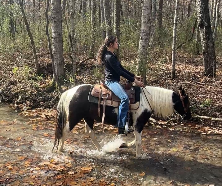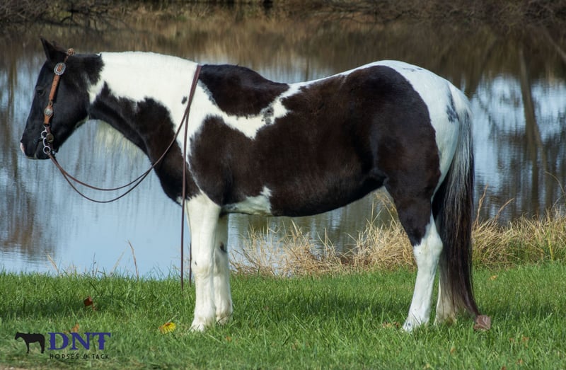 🎄𝐓𝐇𝐄 𝑯𝒐𝒍𝒊𝒅𝒂𝒚 𝐂𝐋𝐀𝐒𝐒𝐈𝐂🎄 Happening now thru MONDAY | DECEMBER 15th - Available EXCLUSIVELY on HorseBid's website! For more details and to register visit: www.Horsebid.com CONSIGNOR CONTACT: Tasha Ijames 270-844-2400 LOCATION: Henderson, KY BREED: Pony REGISTERED: No COLOR: Pinto HEIGHT: 12.3 AGE: 13 GENDER: Mare Cookie is a 13yr old black & white pinto pony mare standing 12.3hh. Cookie is broke, broke, broke for the little kids, bigger kids, and most adults. Cookie has spent her summer at a camp for kids where she was their trail companion and took care of each and every one of them. She is out standing on the trails and has been trail ridden extensively through many different types of terrain. She is sure footed and honest. Cookie is not spooky and will do all the obstacles, cross creeks, go through any body type of water, thick brush, logs, bridges, rough terrain, up and down cliffs with ease and will take care of her rider. Cookie is absolutely traffic safe on the roads. The dogs, heavy machinery, motorcycles and ATV’s does not upset her. You can ride Cookie out alone with ease or with other horses. Cookie has been ridden in the local parades, through drive ins and even through tractor supply. She loves all the attention she gets. Cookie will walk, trot and canter when asked but she prefers to just walk along. She will neck rein like a big horse or you can ride her two handed. Cookie has also been taken to local cattle sortings and loved it. She will stand still for you to get on her. She stands to be groomed, fly spray, stands still to be saddled, takes the bridle with ease, bathes good, loads like a dream, clips great, and stands for the farrier. Cookie is as close to perfect as one can get to take for a ride and teach kids the ropes. If you’re looking for a safe pony! Don’t miss out on Cookie. She’s looking for her forever home to please them kids. We invite anyone and everyone to come meet and ride Cookie at our barn in Henderson, Kentucky. We are happy to assist with transportation arrangements. PPE are welcomed at buyers expense. For any questions about Cookie please contact Tasha 270-844-2400
