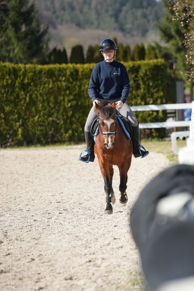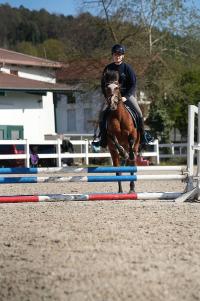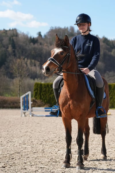Tolle Stute mit dem passenden Go. Sehr leichtrittig und motiviert, aber immer gut zu Händeln. Egal ob Gelände, Springstunde oder Abteilung, immer brav und willig. Ideales Familienpferd, da auch für Erwachsene geeignet