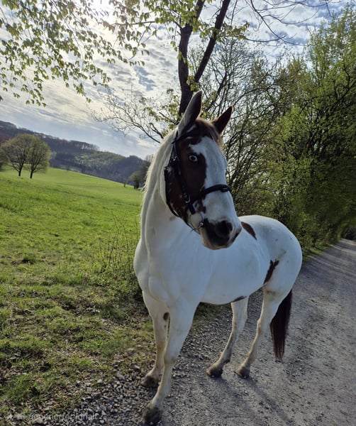 Zum Verkauf steht meine, am 20.05.13 geborene Paint Mix Stute Brada. Stm. 1,48 m. Western und Englisch ausgebildet. Wird zur Zeit aber nur leicht gearbeitet und überwiegend vom Boden aus. Sie geht gern ins Gelände. Sie ist kein Anfänger- oder Kinderpony und gehört in liebevolle aber erfahrene Hände. Das ist auch der Grund weshalb ich sie verkaufe. Ich brauche ein Pferd, dass auch für meine noch unerfahrene Tochter geeignet ist. Brada ist ein 1 Mann/Frau Pferd, dass sich klare Führung wünscht. Zur Zeit steht sie in einer kleinen gemischten Herde und kommt nur über Nacht in die Box.