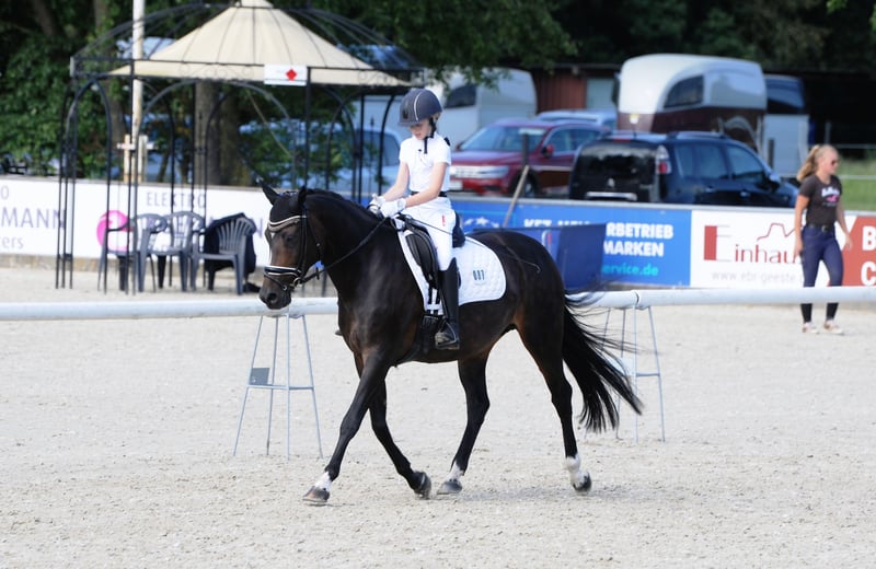 Sehr brave, erfahrene und zuverlässige 15-jährige dunkelbraune Ponystute, Größe 1,48 m. Rainbow Angel ist sehr gut ausgebildet und startete auf Turnieren in der Dressur bis M*. Auch am Sprung zeigt sie sich talentiert - wurde auf Turnieren aber nur in der Dressur vorgestellt. Sie hat sehr gute Bewegungen, kennt auch Wechsel und ist problemlos im Umgang, so dass Kinder gut mit ihr klar kommen. Sie begleitete zwei unserer Enkeltöchter beim Reitunterricht und wurde von den Mädchen auch auf Turnieren vorgestellt - vom Reiterwettbewerb über die Jugendreiterprüfung bis zur Klasse A. Auch bei Ausritten und im Gelände zeigte sie sich stets von ihrer besten Seite. Die Stute ist fit und gesund und sofort einsatzbereit. Sie kennt den Transport auf Anhängern, lässt sich leicht - auch von Kindern - verladen und ist brav beim Hufschmied. Ein TÜV wurde vor etwa zwei Jahren gemacht. Es gab keine besonderen Auffälligkeiten.