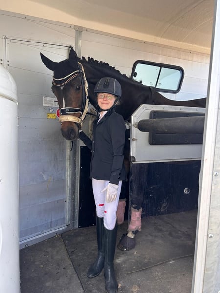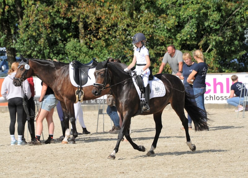Very well-behaved, experienced, and reliable 15-year-old dark bay pony mare, standing at 1.48 meters. Rainbow Angel is highly trained and has competed in dressage up to M* level. She also shows talent in jumping but has only been shown in dressage competitions so far. She has excellent movement, is familiar with flying changes, and is easy to handle, making her suitable for children. She accompanied two of our granddaughters during riding lessons and was also introduced to competitions by the girls — from riding trials and junior rider tests to A-level classes. She consistently performs well during rides and in the terrain. The mare is fit and healthy and ready for immediate use. She is accustomed to transport in trailers, loads easily — even for children — and is well-behaved with the farrier. A veterinary check was carried out about two years ago, with no notable issues.