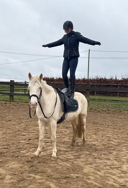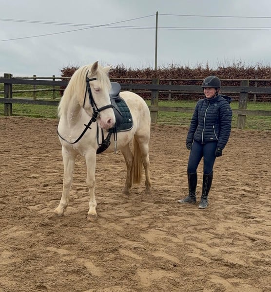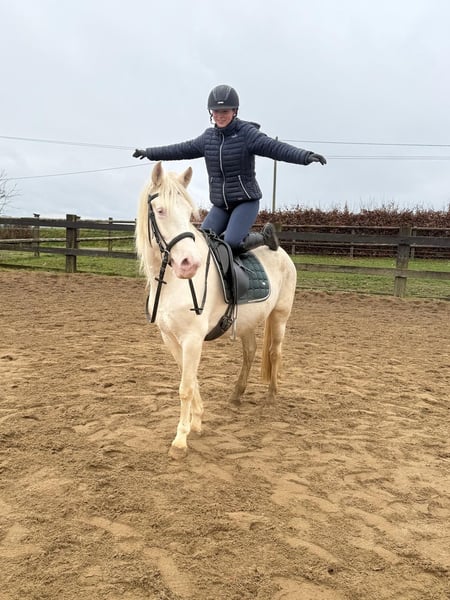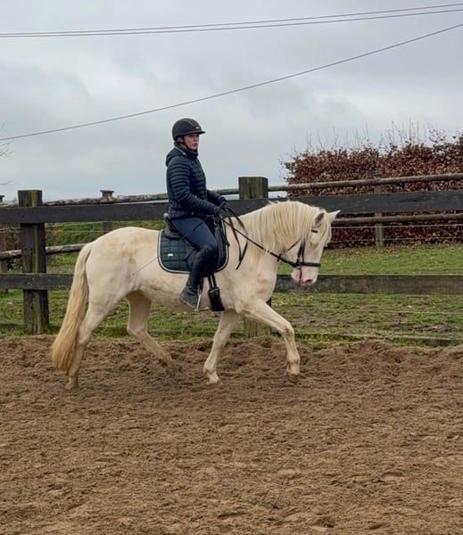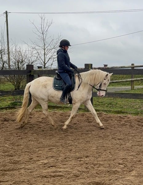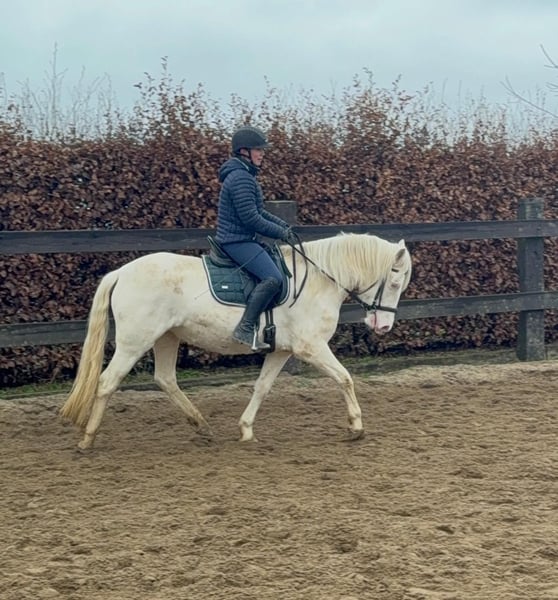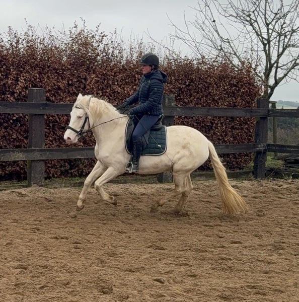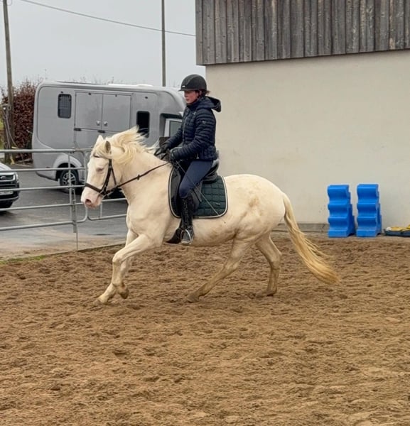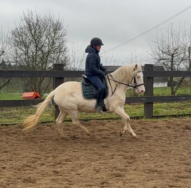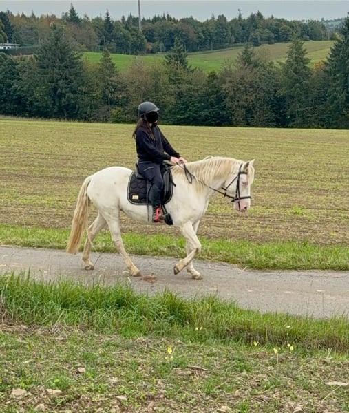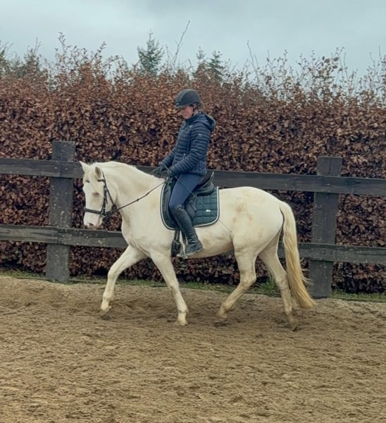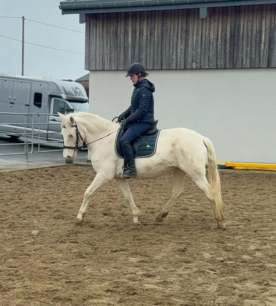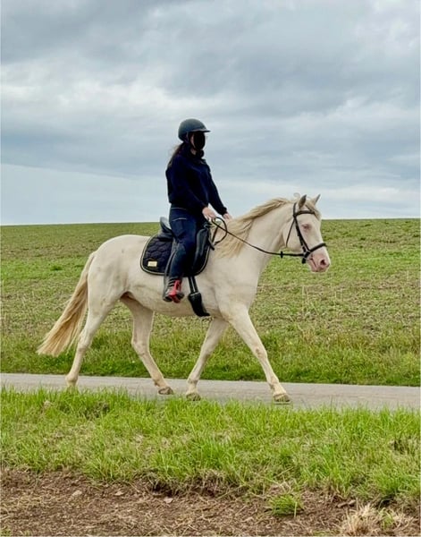 Zum Verkauf steht eine 5 Jahre alte, etwa 152cm große Cremello Stute mit gutem Gebäude und schöner Bewegung. Sie hat einen Pass ohne Abstammung und wird freizeit- dressurmäßig geritten. Bei der dressurmäßigen Arbeit zeigt sie sich talentiert, geht gut am Zügel und arbeitet gerne mit. Einen kleinen Sprung macht sie auch. Sie ist nicht schreckhaft, nicht aufgedreht und ein sehr gelassener ruhiger Typ. Unarten zeigt sie natürlich auch keine. Auch im Umgang ist sie einfach ein Traum und lässt sich alles brav gefallen. Sie wäre bestimmt ein tolles Familienpferd oder auch für eine Reitschule geeignet. Natürlich wäre sie auch ein Pferd für einen ambitionierteren Reiter. Die Hufe wurden frisch ausgeschnitte. Auch das geht ohne Probleme. Krankheiten oder Allergien sind nicht bekannt. Eine AKU darf gerne gemacht werden. Für das Probereiten, Vorreiten oder anderes Ausprobieren des Pferdes berechnen wir 35€. Beim Kauf wird dies gutgeschrieben. Gerne anrufen oder eine Nachricht senden 0157 36803742 Alle Angaben ohne Gewähr, Preisänderungen vorbehalten, Transport möglich, Onlinekauf möglich