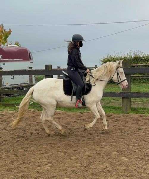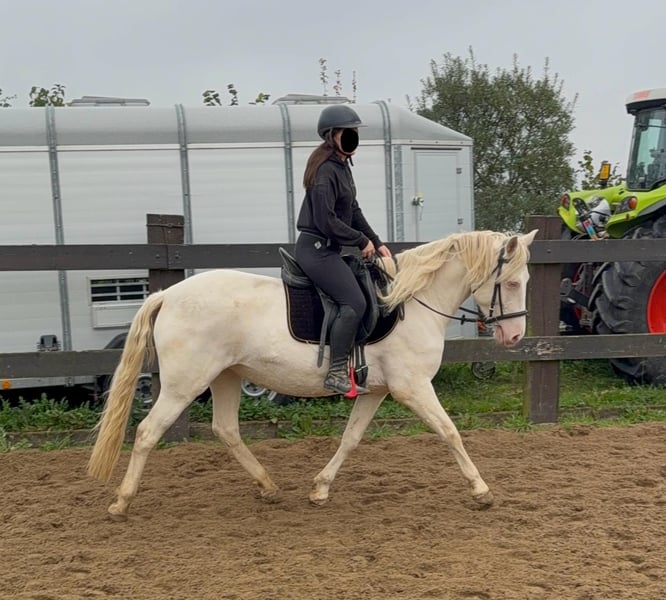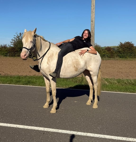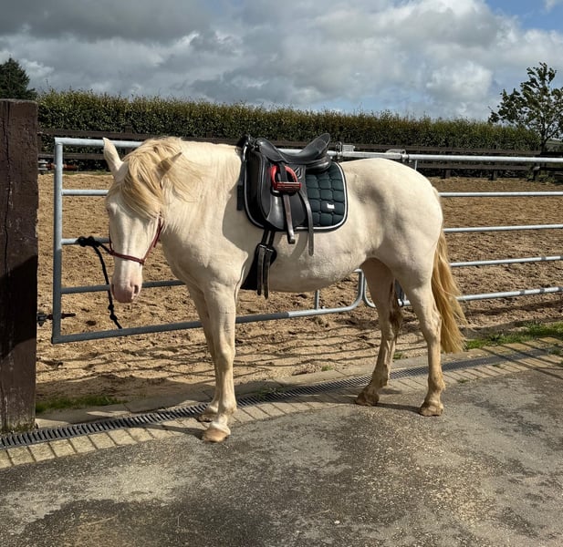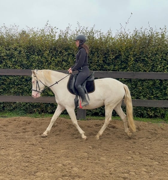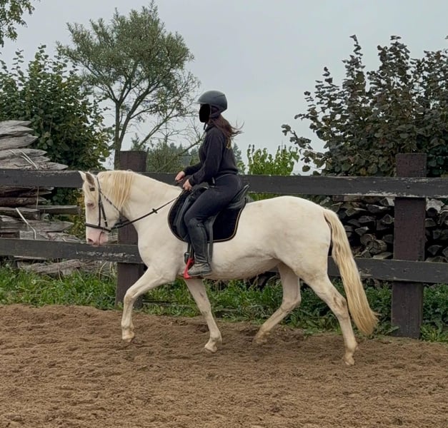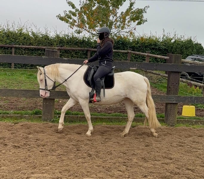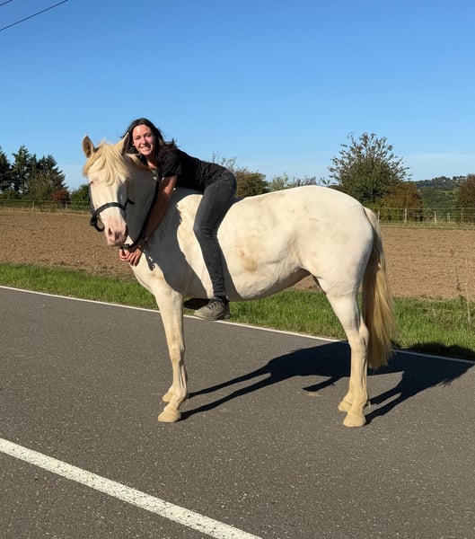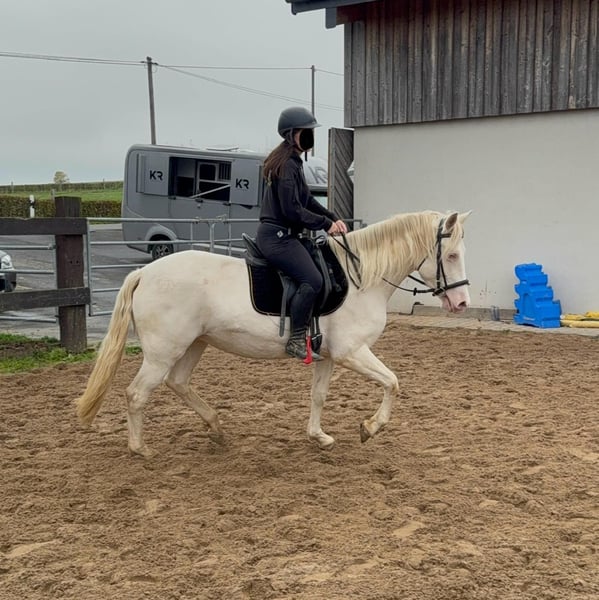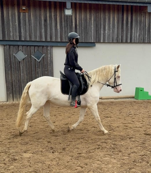 Zum Verkauf steht eine 5 Jahre alte, etwa 150cm große Cremello Stute mit gutem kräftigeren Gebäude (Quarter Typ). Sie hat einen Pass ohne Abstammung und ist freizeitmäßig geritten. Sie ist nicht schreckhaft, nicht aufgedreht und ein sehr gelassener ruhiger Typ. Im Umgang ist sie einfach ein Traum und lässt sich alles brav gefallen. Beim Reiten zeigt sie eher ein ruhiges Tempo, geht teilweise schon schön am Zügel und ist einfach absolut brav und einfach zu reiten. Unarten zeigt sie keine und ist wirklich entspannt mit Reiter. Sie wäre bestimmt ein tolles Familienpferd oder auch für eine Reitschule geeignet. Ohne Sattel reiten macht ihr auch keine Probleme. Die Hufe wurden frisch ausgeschnitte. Auch das geht ohne Probleme. Krankheiten oder Allergien sind nicht bekannt. Eine AKU darf gerne gemacht werden. Für das Probereiten, Vorreiten oder anderes Ausprobieren des Pferdes berechnen wir 35€. Beim Kauf wird dies gutgeschrieben. Gerne anrufen oder eine Nachricht senden 0157 36803742 Alle Angaben ohne Gewähr, Preisänderungen vorbehalten, Transport möglich, Onlinekauf möglich