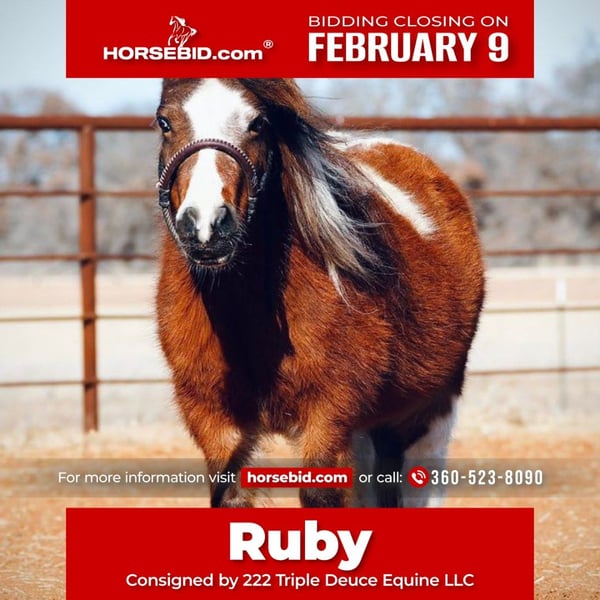 ❤️🔥𝑩𝒆 𝑴𝒊𝒏𝒆 𝐒𝐄𝐋𝐄𝐂𝐓❤️🔥 Happening now thru MONDAY | FEBRUARY 9th - Available EXCLUSIVELY on HorseBid's website! For more details and to register visit: www.Horsebid.com CONSIGNOR CONTACT: 222 Triple Deuce Equine LLC 360-523-8090 LOCATION: Cisco TX BREED: Mini Pony REGISTERED: No COLOR: Bay Paint HEIGHT: 32 Inches AGE: 6 GENDER: Mare Ruby is the FLASHIEST little paint mini pony you will find! With pretty blue eyes and all the color you could ask for, she’s packed into a tiny bundle! Ruby is sweet and gentle; she is very small, so she is best suited for very tiny toddlers. Leadline deluxe. Ruby has been bred and raised a few perfectly made little babies! She is a great mother and breeds and foals easily. She is built right and not dwarfy at all! Ruby would be a wonderful addition to someone’s family as a faithful companion, broodmare, or lead-line pony! Ruby is located in Cisco, TX. Shipping available nationwide. Current negative Coggins. 360-523-8090