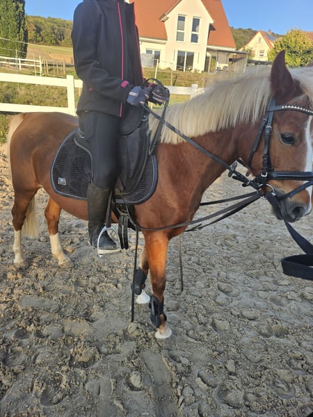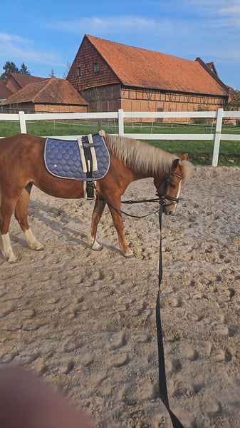Hallo, schweren Herzens muss ich mich aus gesundheitlichen sowie familiäreren Gründen von meiner Ponystute Nelly dringend trennen. Nelly (Nature Girl 3) ist 7 Jahre alt. Sie hat ein Stockmass von 1,35m. Sie ist zwar schon geritten worden allerdings ist sie sehr schreckhaft, unsicher und hat ein Ponysturkopf. Sie wird zur Zeit longiert und eher weniger geritten. Ich habe sie selbst erst seid ca eineinhalb Jahren. Sie ist regelmäßig entwurmt und geimpft worden. Die Zähne wurden letztes Jahr Im Juli gemacht. Tierärzte mag sie nicht so gerne. Beim impfen oder Blutabnahme macht sie Anstalten zu steigen aber durch ihre Größe ist sie händelbar. Sie ist aber durch geimpft. Auch regelmäßig beim Schmied zum ausschneiden. Sie kommt leider bei mir zu kurz. Bei uns steht sie in einer Paddockbox. Sie ist leider kein Anfänger Pony aber sie ist lernwillig. Sie benötigt eine Person die ihr Sicherheit gibt. Geritten wurde sie von mir mit einem Baumlossattel. Trense, Sattel und sämtliche Decken können mit erworben werden. Sie stand letztes Jahr stundenweise auf der Wiese, dieses Jahr habe ich sie auf ein separaten Paddock gestellt, sie hat keine Krankheiten aber da sie sich sehr gefressig und nicht viel Bewegung bekommt, ist mir das zu riskant. Ich suche für Sie ein Person die ihr die nötige Sicherheit und Erfahrung und Zeit geben kann. Da mir leider die Zeit fehlt und es mir gesundheitlich nicht gut geht, sucht sie dringend ein neues Zuhause. Bei Fragen gern melden. Wir beißen nicht.