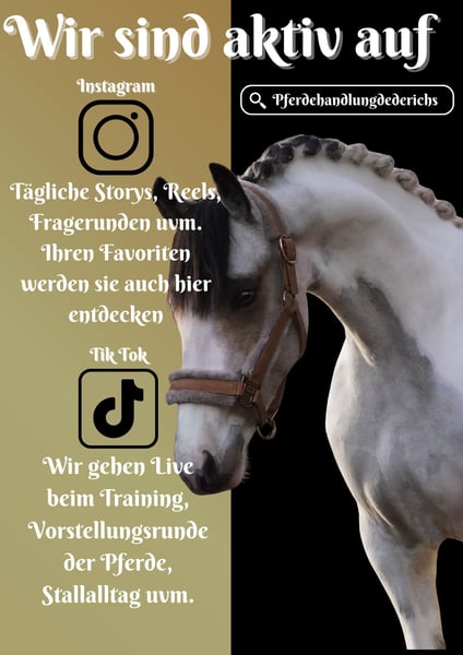 Iris ist eine 2018 geborene Ponystute ca. 146cm *Iris* bildschöne Stute in Sonderfarbe. Iris ist bereits erfolgreich mit Kindern auf dem Turnier gestartet und bereitet in der Dressur wie auch im Springparcour viel Freude. Sie geht alleine und in der Gruppe ins Gelände. Iris ist nicht umweltorientiert. Iris ist leicht in Anlehnung zu reiten und sitzbequem dazu. Ein Traumhaft schönes Pony Pferdehandlung Dederichs – Ihr Partner für den Pferdekauf Kontakt & Erreichbarkeit: Anfragen bitte ausschließlich telefonisch unter 0173/9792139 Montag – Freitag: 09:00 – 18:00 Uhr Samstag: 09:00 – 15:00 Uhr Sonntag: Ruhetag Folgen Sie uns auf Social Media! Erleben Sie unseren Alltag mit den Verkaufspferden auf Instagram, TikTok & Facebook unter Pferdehandlung Dederichs Rabatt: Bei sofortiger Mitnahme Ihres neuen Traumpferdes erhalten Sie zwischen 5 %– 10 % Rabatt Probereiten & Vorführen: • Probereiten: 30 € pro Pferd (max. 2 Reiter), Betrag wird beim Kauf angerechnet • Feiertage: Proberitt 50 € • Vorführung durch unsere Bereiter: 25 € pro Pferd (Vorreiten, Bodenarbeit etc.) Ankaufsuntersuchung & Transport: • Viele unserer Pferde besitzen bereits eine AKU • Sie können selbstverständlich Ihren eigenen Tierarzt mitbringen • Gerne organisieren wir eine Untersuchung • Wir unterstützen Sie auch gerne beim Transport ins neue Zuhause Weitere Verkaufspferde: In unserem Stall stehen weitere Verkaufspferde, die noch nicht online sind. Falls Ihr Traumpferd noch nicht dabei ist, zögern Sie nicht, uns zu kontaktieren. Wichtige Hinweise: • Stockmaß-Angaben sind geschätzt und nicht exakt nachgemessen • Alle Beschreibungen sind subjektive Einschätzungen des Verkäufers und keine zugesicherten Eigenschaften Weitere Informationen finden Sie unter: www.Pferdehandlung-Dederichs.de