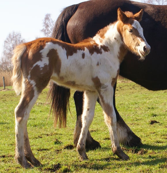 Fuchsschecke mit bernsteinfarbigen Augen, Vater ist ein Painthengst 150 cm, die Mutter eine kräftige Tinkerstute 150 cm, wüchsiges kräftiges Fohlen, aufgeweckt und neugierig, wächst im Herdenverband mit anderen Fohlen zusammen auf, regelmäßig entwurmt, es gibt bereits Nachkommen aus dieser Anpaarung welche besichtigt werden können, es ist immer ein gelungener Mix
