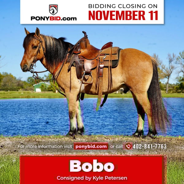 𝓽𝓱𝓮 𝐑𝐈𝐃𝐄𝐑'𝐒 𝓒𝓱𝓸𝓲𝓬𝓮 🐴 𝐏𝐎𝐍𝐘 𝐄𝐃𝐈𝐓𝐈𝐎𝐍 🐴 Happening now thru TUESDAY | NOVEMBER 11th - Available EXCLUSIVELY on Ponybid's website! For more details and to register visit: www.Ponybid.com CONSIGNOR CONTACT: Kyle Petersen 402-841-7763 LOCATION: Corsica SD BREED: Pony REGISTERED: No COLOR: Dun HEIGHT: 12.3 AGE: 9 GENDER: Gelding Bobo is one cool dun pony he is 9 years old 13 hands and cute as button! Rockstar is gentle with no buck rear kick or bite, and he is broke the very best. Bobo has a great handle walk trot lopes around great, he is level headed and super easy to ride, he is great for all ages but big enough mom and dad can jump on him, he is good to catch, good for farrier, good with other horses and ponies, good around dogs and equipment. He is a super nice pony that everyone would like to have around. Call or text Kyle Petersen 402-841-7763