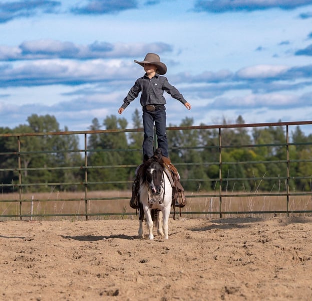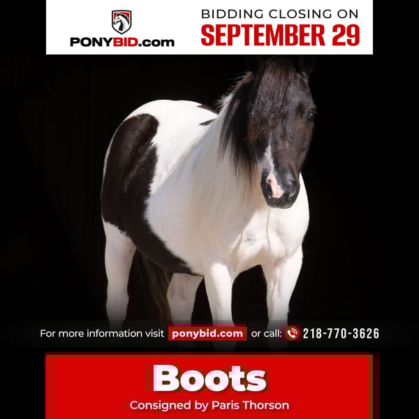 🐴 𝒕𝒉𝒆 𝐅𝐀𝐋𝐋 ℙ𝕆ℕ𝕐 𝑺𝒑𝒆𝒄𝒕𝒂𝒄𝒖𝒍𝒂𝒓🐴 Happening now thru MONDAY | SEPTEMBER 29th - Available EXCLUSIVELY on Ponybid's website! For more details and to register visit: www.Ponybid.com CONSIGNOR CONTACT: Paris Thorson 218-770-3626 LOCATION: Nevis, MN BREED: Pony REGISTERED: No COLOR: Black and White Paint HEIGHT: 36 " AGE: 10 GENDER: Gelding Looking for that once-in-a-lifetime pony that’s as versatile as he is adorable? Look no further than Boots – 36 inches of absolute cuteness, personality, and grit! This little gelding is packed full of heart, and he’s always up for an adventure. Whether it’s heading down the trail, exploring town from the cart, or working cattle on the ranch, Boots is ready to go and eager to please. With his can-do attitude, he’s the kind of pony every cowboy or cowgirl dreams of growing up with. Boots has been exposed to just about everything you can imagine – and takes it all in stride. He’s been on countless trail rides, confidently going over logs, through brush, splashing in creeks, and strolling down busy streets. Don’t let his size fool you – Boots is a true ranch hand. From gathering cows in wide open pastures to helping bring steers up to the roping boxes, this little guy knows his job and does it well. He’s sure-footed, responsive, and smart – the kind of pony that earns his keep and makes it look easy. He’s been a trusted partner in all kinds of ranch work, helping his young rider learn and grow in confidence every step of the way. Boots is the best step up pony for the little rider looking to have a day filled with fun. Boots also shines in the cart, making him a blast for the whole family. Whether you're headed to town, a parade, or just out for a Sunday drive, Boots drives like a dream and absolutely soaks up the attention. He loves having a job – and that job might just be putting a smile on everyone's face! He’s the kind of pony that brings people together, with his fun personality and willingness to go anywhere you ask. If you're looking for a pony that checks all the boxes, cute as can be, and fun for the whole family, then Boots is your guy. Whether he’s ponying across a pasture, pulling the cart to town, or being the star of your next family photo, he’s the kind that every family wants in their pasture. Don’t miss your chance to own a pony that truly does it all – and looks adorable doing it!
