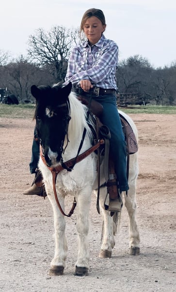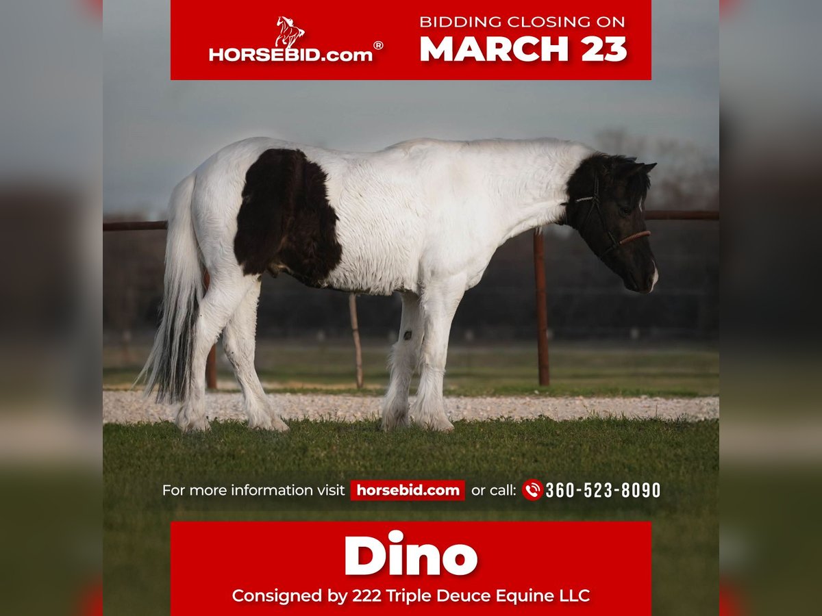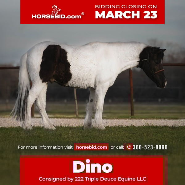 ⚜️𝓽𝓱𝓮 𝐆𝐎𝐋𝐃 𝓢𝓮𝓵𝓮𝓬𝓽⚜️ Happening now thru MONDAY | MARCH 23rd - Available EXCLUSIVELY on HorseBid's website! For more details and to register visit: www.Horsebid.com CONSIGNOR CONTACT: 222 Triple Deuce Equine LLC 360-523-8090 LOCATION: Cisco TX BREED: Pony REGISTERED: No COLOR: Black & White Paint HEIGHT: AGE: 13 GENDER: Gelding 🦖Dino🦖 Here’s a pony that rides and travels like a big horse, just in a small horse body! If you have a kid who wants to ride all day, inside or outside the arena, this is your guy! One hand broke, walk, trot, and a perfect rocking horse lope! Dino has covered many miles outside, moving cattle and packing in the mountains. He does great riding out alone or in a group. Does NOT get buddied up or barn sour. Lesson kids play with him on barrels and take him over small jumps! He can go all day but is NOT hot or too forward. He goes only the speed he is asked! Dino is very well-behaved, 100% SAFE & BROKE with a good attitude! Stands quit tied up for hours, loads easily and is easy to catch. He does do his best when ridden and used more than once a year… If he sits for too long, he can start acting a bit pony-like, as most ponies and horses do. Remember these are live animals, not robots! They need rode and maintained to stay their best. 🥇 Dino is sound and clean all the way around. Good feet, barefoot. Here is a great step up before you move your little one up to a big horse. Please feel free to reach out with any questions or to set up a time to bring your kid out to come meet and ride Dino! Cisco, TX Shipping available nationwide 🚍 360-523-8090