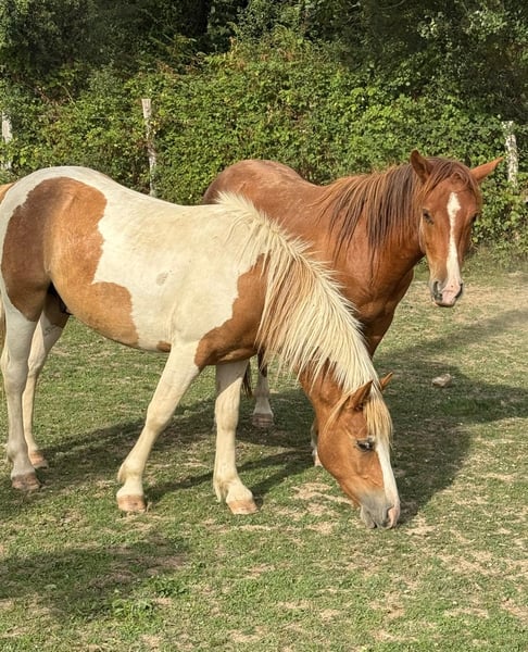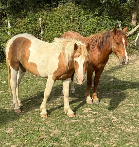 Se vende un potro macho de pony pintado de 2 años. Altura estimada 137 cm. Ha crecido en grupo de manera adecuada y es muy sociable con las personas. Es tranquilo en el manejo y sabe llevar el cabestro. Las pezuñas han sido recortadas regularmente y recientemente, y ha sido cargado en el remolque varias veces. Con la formación adecuada, seguramente será un excelente pony familiar. No se conocen enfermedades ni alergias. Se puede realizar una revisión veterinaria. No dude en llamar o enviar un mensaje al 0157 36803742. Todos los datos son sin garantía, cambios de precio reservados, transporte posible, compra en línea posible.