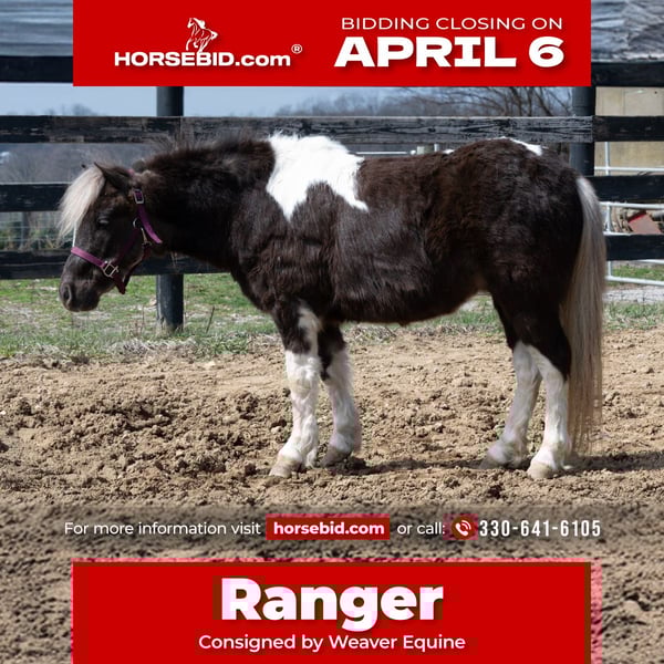🌟𝑨𝒑𝒓𝒊𝒍 𝐀𝐋𝐋 𝐒𝐓𝐀𝐑 𝐋𝐈𝐍𝐄𝐔𝐏🌟 Happening now thru MONDAY | APRIL 6th - Available EXCLUSIVELY on HorseBid's website! For more details and to register visit: www.Horsebid.com CONSIGNOR CONTACT: Weaver Equine 330-641-6105 LOCATION: Fredericksburg, OH BREED: Miniature pony REGISTERED: No COLOR: Paint HEIGHT: 36 in AGE: 4 GENDER: Gelding It's Ranger! This lucky little guy has been loved and ridden by this pony obsessed 2 yr old girl and he has loved every minute of it! He is very well broke to ride and drive. He will go anywhere you ask him too! He is very gentle and calm natured. He is easy to catch. He will stand well to be brushed and tacked. He loves kids. He will happily plod around all day whether hitched or saddled. He does not mind obstacles and tarp. He is the kid that you can turn your kids loose on and he will take care of them all day! Ranger has thee sweetest attitude. He is easy on the lead line. He trailer loads well. Requires no maintenance. 100% sound! Please reach out with any further questions! 330-641-6105