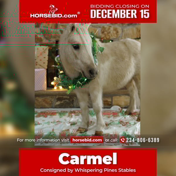 🎄𝐓𝐇𝐄 𝑯𝒐𝒍𝒊𝒅𝒂𝒚 𝐂𝐋𝐀𝐒𝐒𝐈𝐂🎄 Happening now thru MONDAY | DECEMBER 15th - Available EXCLUSIVELY on HorseBid's website! For more details and to register visit: www.Horsebid.com CONSIGNOR CONTACT: Whispering Pines Stables 234-806-6389 LOCATION: Bristolville OH BREED: Miniature paint palomino REGISTERED: No COLOR: Palimino Paint HEIGHT: 37 in AGE: 3 GENDER: Gelding Carmel is a sweet 3 yr old miniature palomino paint gelding that would make a wonderful Christmas present for your children !! 37 in tall and is a pretty palomino paint color that will make heads turn! Carmel aims to please and is broke for everyone !! If you’re looking for a kid safe pony that will make a wonderful babysitter, Carmel will be the one!! Whether you want to take a drive with him in the cart or hitch him to the sled and drive through beautiful snowy fields he will willingly take you wherever you need to go. He will also make a wonderful companion for your children and if they want to hop on his back and go for a ride he will give them a lift and take them wherever they want to go, through the creeks and trails ect. When they are tired of riding or driving and want to take a rest in the house he will follow them right in and have a snack with them and lay down and rest awhile. Make sure you have donuts :) He will go through obstacles and have fun while doing it, Does well with beginners and will be safe for everyone!! Does well with all animals and has been a sweet addition to our farm but He is now ready for a new home even if it may cause a few shed tears on our part because of the sweet little pony he is!! Don’t miss out on him!!