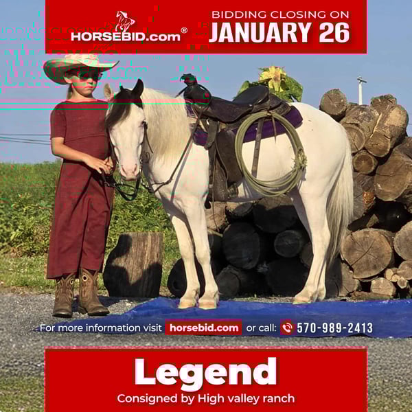 𝐉𝐀𝐍𝐔𝐀𝐑𝐘 ⭐️𝑨𝒍𝒍 𝑺𝒕𝒂𝒓 𝑳𝒊𝒏𝒆𝒖𝒑⭐️ Happening now thru MONDAY | JANUARY 26th - Available EXCLUSIVELY on HorseBid's website! For more details and to register visit: www.Horsebid.com CONSIGNOR CONTACT: High valley ranch 570-989-2413 LOCATION: Allenwood, PA BREED: Pony REGISTERED: No REGISTERED NAME: Legend COLOR: Paint HEIGHT: 40 inch AGE: 5 GENDER: Gelding Legend is a 5 year gelding broke to ride and drive and is an absolute stand out where ever you go from trail riding to driving on the busy highway he enjoys his job and always trying to do his best Loves attention and loves when the kids braid and groom him Legend will go through water steps over logs goes through the obstacle course with no problem he carries the flag and walks over a tarp, very gentle and good with little children never trys to kick or bite Legend will ride in the arena or trail with large groups or alone and he always loves life so if you are looking for that next out standing pony Legend could be the one your looking for, Legend is up-to-date on worming and trimming and is very healthy and will have a current coggins Feelfree to call or text with any questions or to make appointment to come meet Legend 570 989 2413 We can help arrange shipping anywhere in the United States