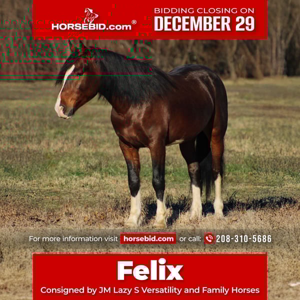 ⚜️ 𝓗𝓮𝓻𝓲𝓽𝓪𝓰𝓮 𝐖𝐢𝐧𝐭𝐞𝐫 𝓒𝓵𝓪𝓼𝓼𝓲𝓬⚜️ Happening now thru MONDAY | DECEMBER 29th - Available EXCLUSIVELY on HorseBid's website! For more details and to register visit: www.Horsebid.com CONSIGNOR CONTACT: JM Lazy S Versatility and Family Horses 208-310-5686 LOCATION: Baxter Springs, KS BREED: Sport Pony REGISTERED: No COLOR: Bay Paint HEIGHT: 14 AGE: 5 GENDER: Gelding Felix is a 2020 14.0-hand sporty and flashy pony who is about as cool as they come. Extra athletic and full of try, Felix is the kind of pony that would be an absolute blast for a handy kiddo or smaller adult to take on and finish out in just about any direction. With his natural talent and presence, he would shine as a Pony Club mount, a small but mighty fox hunter, or a competitive mounted pony games partner. Felix boasts a beautiful trot with plenty of extension and expression, and an exceptionally easy lope that he can step into smoothly from any gait in just one stride. He has a fantastic turnaround, stays soft through his face and sides, and is responsive without being too much—making him fun, athletic, and rewarding to ride. He’s quick-footed, balanced, and truly enjoys having a goal and a mission. He put his heart into everything he does and has an outstanding work ethic and willings to try. Felix has been confidently started over jumps and logs and absolutely loves it! He approaches each obstacle with enthusiasm and a willingness to please. He’s equally talented and brave navigating trail challenges such as logs, water crossings, brush, bogs, and bridges, showing steady focus. Felix has also been exposed to light ranch work and has experience around cattle. He has helped gather, sort, and move cattle, showing a willing, sensible attitude and staying thoughtful and brave in new situations. On the ground, Felix is a pleasure to be around. He has a shy but, curious and kind personality, he’s sweet and loves snacks and pets! He has tons of mane and tail, is good with his feet, ties quietly, loads easily, and is easy to blanket, saddle, and bridle. Felix is up to date on dental work, chiropractic care, worming, and farrier care, and he has current X-rays available for viewing at the link below. For more information about Felix, call or text John at (208) 310-5686. This is a special pony with the athleticism, looks, and heart to be a standout partner for the right rider.v