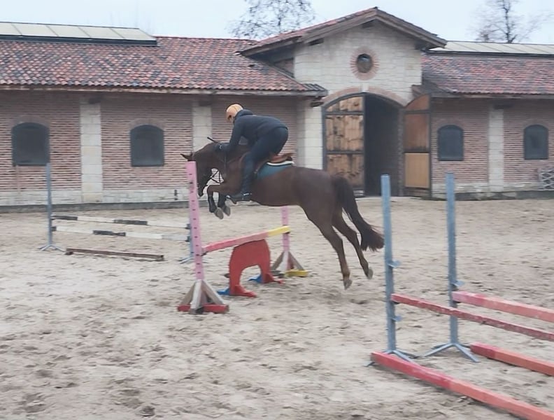 144cm gelding, very brave and easy to ride, loves people. Ready for 90 cm courses. Very comfortable jump, used to being ridden correctly so ideally a pony for someone who already has some experience, big enough also for small adult. Enjoys hacking alone and in group, easy to transport, clip, trim. Lots of videos available