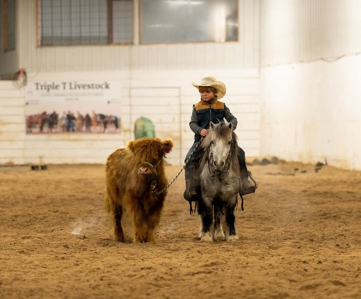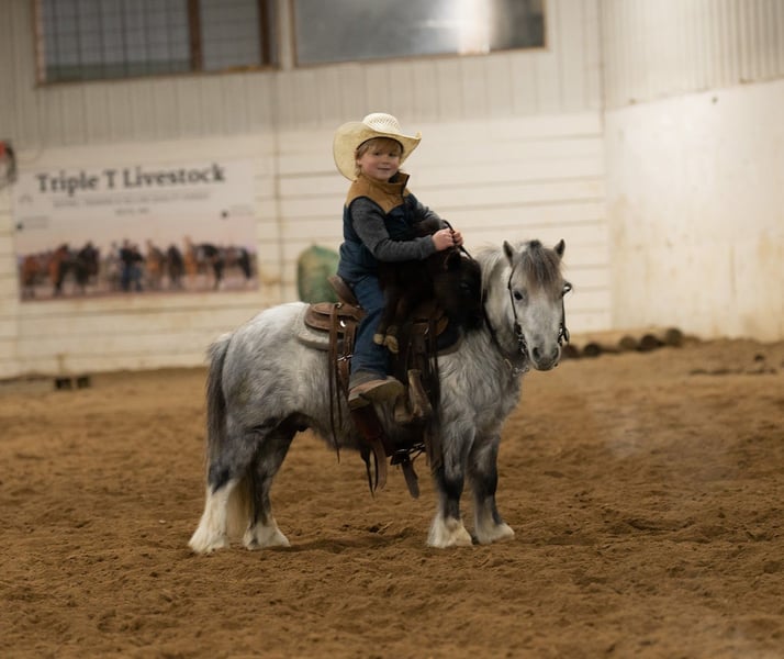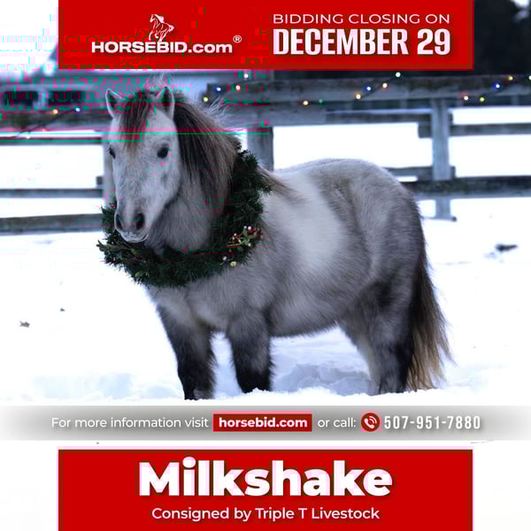 ⚜️ 𝓗𝓮𝓻𝓲𝓽𝓪𝓰𝓮 𝐖𝐢𝐧𝐭𝐞𝐫 𝓒𝓵𝓪𝓼𝓼𝓲𝓬⚜️ Happening now thru MONDAY | DECEMBER 29th - Available EXCLUSIVELY on HorseBid's website! For more details and to register visit: www.Horsebid.com CONSIGNOR CONTACT: Triple T Livestock 507-951-7880 LOCATION: Nevis, MN BREED: Pony REGISTERED: No COLOR: Gray HEIGHT: 38” AGE: 6 GENDER: Gelding Milkshake is a 6-year-old, 38-inch pony that truly earns the title Ranch Pony Deluxe. Don’t let his size fool you—Milkshake shows up every day with a big-horse work ethic and a can-do attitude. He’s been around cattle, knows his job, and confidently handles real ranch work with ease. From checking cattle to dragging anything you need pulled, this little guy is all business when it’s time to get things done. In the saddle, Milkshake is a joy to ride. He has a sweet, comfortable pony lope, steers great, and stays soft and willing at all times. He’s handy, responsive, and easy to get along with, making him a fun mount whether you’re riding in the arena or out doing chores. He’s also excellent with dogs—he doesn’t mind them running alongside or even hopping up in the saddle. Milkshake has been enjoyed by our 6-year-old nephew, who has had an absolute blast riding him. He’s gentle, yet still has plenty of try and heart for a kid who wants to be involved in real ranch life. This is the kind of pony that builds confidence, teaches responsibility, and makes memories that last a lifetime. Milkshake is also broke to drive. He drives outstanding and is very trained. He swings both ways, walks, trots and really pulls good. This pony may be small, but he has a huge heart and an even bigger willingness to please. Milkshake is the definition of handy, and fun—and maybe don’t tell him he isn’t a big horse… because we’re pretty sure he doesn’t know he’s tiny 🙂