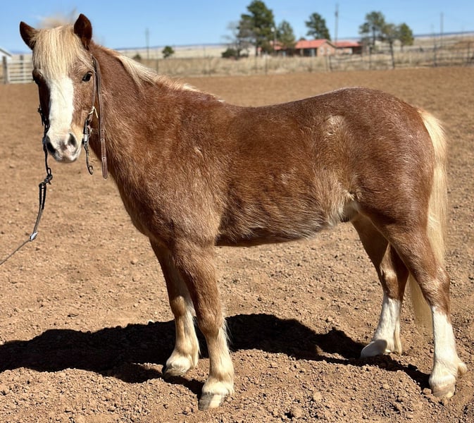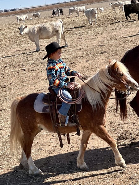 ⚜️𝓽𝓱𝓮 𝐆𝐎𝐋𝐃 𝓢𝓮𝓵𝓮𝓬𝓽⚜️ Happening now thru MONDAY | MARCH 23rd - Available EXCLUSIVELY on HorseBid's website! For more details and to register visit: www.Horsebid.com CONSIGNOR CONTACT: Zia Gililland 432-448-7304 LOCATION: Edgewood, NM BREED: Pony REGISTERED: No COLOR: Red Roan HEIGHT: 45 inches AGE: 8 GENDER: Gelding Pac-Man, known as “Mr. Handsome” by my daughter, is an absolute hunk! Not only is he a stunning red roan, he rides around even better than he looks. Pac-Man is 8 years old and stands 45 inches tall — the perfect pony size. Pac-Man is very BROKE, the kind that makes it easy for a kiddo. He’ll keep up with the big horses all day long and will walk/long trot right along while checking cattle. He’s been ridden outside, roped the dummy off of, and is always happy to go through playday events- Or go on a casual stroll Pac-Man is the kind everyone looks for when it comes to a pony. He’s easy to steer, honest, and when asked he’ll drag his butt better than most horses. He has the ability and confidence to take a rider to the next level. PAC-Man is very responsive, he will walk, trot and lope with zero fuss! He’s a bigger-moving pony with a ground-covering stride. He has the miles to back it up too -Checking on momma cows keeping up with the big horses all day long without hesitation. This gelding is gentle, level-headed, and stays the same every ride. The most important part is that he’s 100% safe. It’s nothing to see my 6-year-old daughter Zia riding him around double with her cousin at ropings. Kids absolutely love Pac-Man, and he never gets fresh. He truly is a good boy with a lot to offer his littles! Please don’t hesitate to call with any questions: 432-448-7304 Location: Edgewood, NM Arranged shipping available