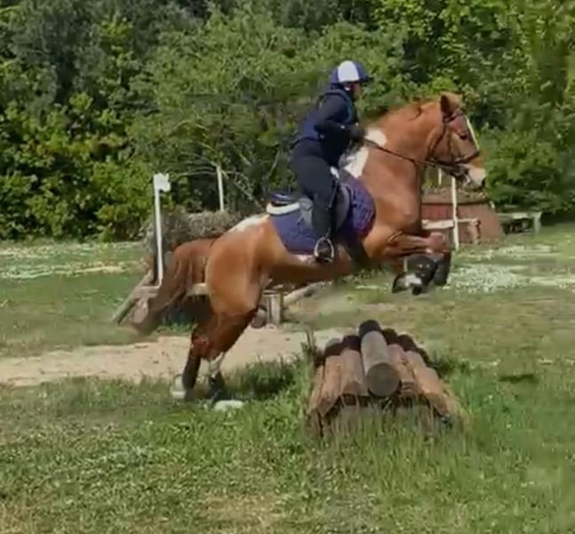 AB ZOOM IND Sportliches Pony, Höhe 147 cm, 8 Jahre alt, tobiano fuchsfarbig. APA-Pass, bei Fise registriert.