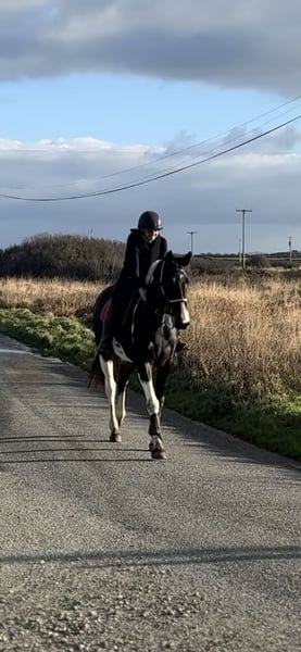 Absolutely divine 16.3hh 4yo Piebald Mare. By Russian Monarch / Glenhill Gold out of a Colin Diamond mare. A truly special young mare with all the attributes to make a top-class allrounder or competition prospect. She is such a quality mare and has the kindest temperament you could wish for. She has been lightly and correctly started, and showed maturity beyond her years. Before being turned away she hacked alone and in company. Worked in the school on 3 occasions in walk, trot and canter and loose jumped over some XC fences. She has natural balanced paces for a bigger horse, and showed a lot of jump ability. I can’t emphasise how honest, bold and straightforward she has been. She has such a lovely attitude and was so incredibly level headed with everything asked of her when she was backed. She has the brain and temperament to suit an amateur rider but the quality to progress further in the right hands too. Her temperament is second to none — genuinely one of the kindest, easiest mares you will ever meet. She is mannerly on the ground, willing under saddle, and just a pleasure to own. Only available due to personal circumstances — this mare is my absolute dream horse and this is a genuinely gutting decision.