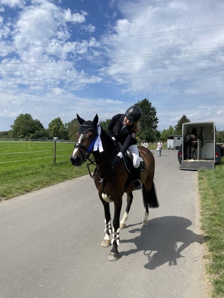 Da meine Ponyzeit nach diesem Jahr endet, suche ich für Mr. Magic Jimmy B ein neues Zuhause. Magic ist ein 10-jähriges irisches Sportpony (148 cm eingemessen), das besonders im Springen begeistert. Er hat Siege und Platzierungen bis L-Springen gegen Großpferde gesammelt und dort regelmäßig tolle Noten bis in den 8er-Bereich bekommen. Erste Starts in M-Springen hat er bereits absolviert. Dressur beherrscht er bis Klasse L, aber am glücklichsten ist er eindeutig im Parcours. Ich kenne Magic schon seit 2020 und durfte ihn regelmäßig reiten. Im September 2023 haben wir ihn schließlich gekauft. Gemeinsam haben wir im Springreiterwettbewerb angefangen und uns bis in die Klasse M hochgearbeitet. Magic gibt immer sein Bestes und ist dabei ein verlässlicher Partner, der Fehler verzeiht und mir viel Sicherheit vermittelt hat. Im täglichen Umgang ist er total unkompliziert: brav beim Tierarzt, Hufschmied und Zahnarzt, verladefromm und problemlos im Hänger oder Transporter. Gesundheitlich ist er topfit, eine Ankaufsuntersuchung mit Röntgenbildern von 2023 liegt vor. Alle Impfungen nach LPO, inklusive Herpes, sind selbstverständlich gemacht. Ich wünsche mir für Magic ein ambitioniertes Kind im E/A-Bereich, das ein ehrliches und leistungsbereites Sportpony sucht, mit dem man gemeinsam wachsen kann – so wie ich es durfte.