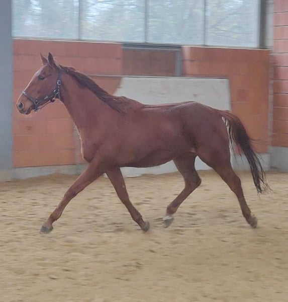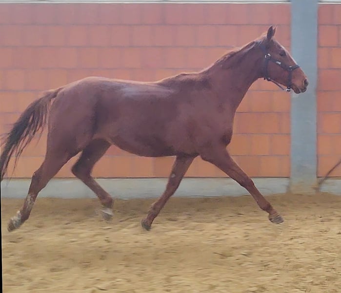 Stylish chestnut gelding with excellent conformation and movement. He stands approximately 16.1 hh and was born in 2021. An outgoing horse that is receptive to training and development. We are looking to place him in responsible hands where he will be regarded as a partner rather than just a sports tool. If desired, he can be sold with a complete set of new accessories for a small additional fee. Transportation can be arranged. We look forward to your call at 01774289729. Written inquiries will not be answered. Calls from blocked numbers will be automatically rejected.