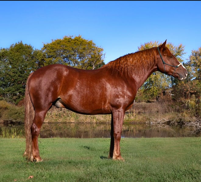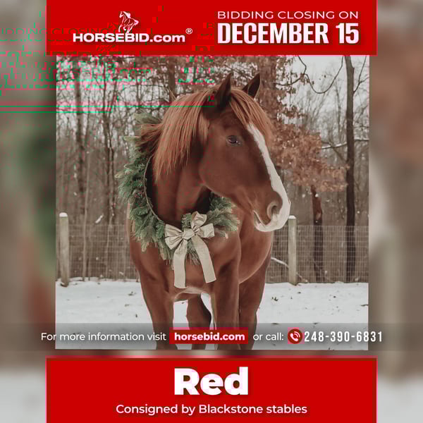 🎄𝐓𝐇𝐄 𝑯𝒐𝒍𝒊𝒅𝒂𝒚 𝐂𝐋𝐀𝐒𝐒𝐈𝐂🎄 Happening now thru MONDAY | DECEMBER 15th - Available EXCLUSIVELY on HorseBid's website! For more details and to register visit: www.Horsebid.com CONSIGNOR CONTACT: Blackstone Stables 248-390-6831 LOCATION: Howell MI BREED: Irish sport horse REGISTERED: No COLOR: Chestnut HEIGHT: 16.2 AGE: 6 GENDER: Gelding Red is a 6-year-old Irish Sport Horse gelding. He is an absolute delight not only to ride but also to be around. This boy wants to be your best friend and is always happy to greet you at the pasture gate. He stands a solid 16.2hh. Red is an extremely versatile horse. He will walk, trot, and canter with just a tap of your heel and stops with a simple “whoa.” He’s very light on his feet and soft in your hand. Red is as smooth as a couch, and his gaits are all balanced. He is a substantially built guy who is also very athletic. He has great bone structure and nice, big, solid hooves. He stands well for the farrier. Red has a beautiful face and a pleasant, kind eye. He has a calm yet willing nature. Take him out on the trails, down the road, for a hack out in the field, or for a ride in the arena he is an easygoing guy wherever you take him. Red would make an amazing hunt horse. He is great with kids and adults alike and will make you want to get out and ride. He is the type who can easily carry a bigger rider, as he takes up a lot of leg. Red also jumps. He's been on many hunter paces. He jumps right around. He has a great hunter canter and is delightful to watch go, and even more fun to ride. He stands tied anywhere, for anything. Here’s a truly versatile horse one Grandpa can take on a fox hunt while a teen rider can take him to a show the very next day. He gets along with all horses, ponies, and farm animals. Red is located in Howell, Michigan 48855. For more information, give Ellesse Schwarz a call or text at 248-390-6831