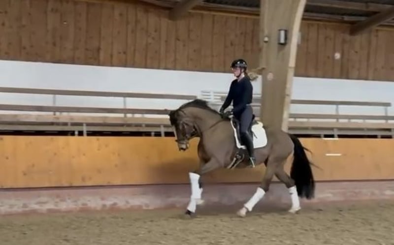 Cavalla mare di 5 anni, da allevatore, figlia di "Von und Zu" - Don Bosco - Prince Thatch xx. Nobile, con tratti distintivi del bisnonno "Prince Thatch xx", candidata al premio di bellezza, con ottime capacità nel dressage, combinata con buona maneggevolezza e un carattere molto orientato alle persone. Particolarmente evidente è l'attiva posteriorità, con un passo eccezionale. L'addestramento, iniziato con cura e basato sulla fiducia, da parte di un'amatrice e amazzone di salto, costituisce una solida base per lo sviluppo futuro. Un diamante grezzo per il futuro, sia per lo sport che per l'equitazione ricreativa. I fratelli di criniera corta hanno già percorso questa strada, arrivando, tra l'altro, a vincere più volte il Grand Prix. Ottime radiografie. Tel. 0171 9901553