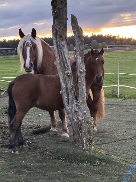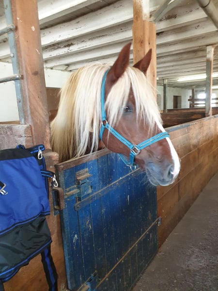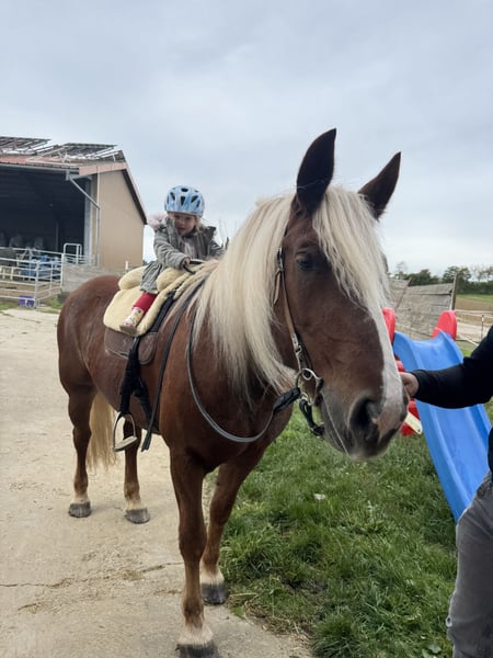 We are selling our heavy draft mare with a heavy heart, as she is unfortunately not getting enough attention with us. Resi was born in 2009 and stands at approximately 1.63 m (16.1 hh). She is incredibly sweet and always up for fun. She has never been naughty with us, but she does have her own mind. We ride her English, but she could also be trained Western. Her favorite activity is going out on trail rides. You can also do vaulting on her, which she does very well. In winter, we attach a sled, and she pulls the kids behind her without any issues. Children can ride her on a lead, but she does need a rider who can guide her on what to do; however, she won't be naughty or difficult. At our place, she stays in a stall at night and is out on a paddock during the day. She has been in a mixed herd and is very sociable. We will include some equipment, but not a saddle. If you would like to get to know Resi, please feel free to contact us. You can also reach us via WhatsApp at 017674741030.