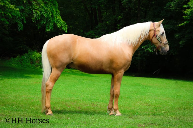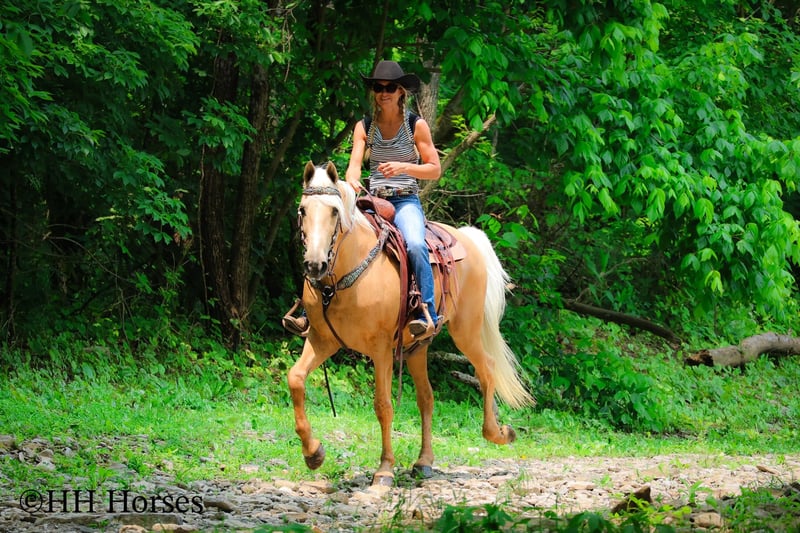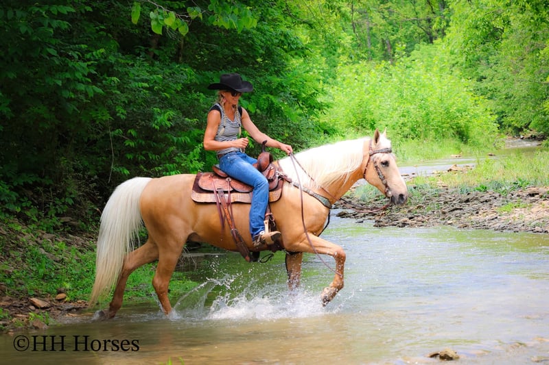 ONLINE AUCTION Place your bids at www.PlatinumEquineAuction.com Starting Bid $3500 Auction ends June 15th, 2025 Need a new saddle? Check out White Rock Saddles on our website or Facebook! This is “A Golden SUNBEAM”, one of the coolest, smoothest, and fanciest GOLDEN PALOMINO KENTUKCY MOUNTAIN GELDINGS around! He is well broke, extra handsome, and super fun to ride. He is 9 years old and stands 15 hands tall. He is very well built and has an attractive way of traveling. He has been out in the pastures to check cattle, in the mountains, and in the thick timber. He is sure footed and has lots of heart. He has a nice 4 beat gait, a super smooth collected canter, a solid stop, and a ONE HAND NECK REIN. He is a solid and seasoned trail mount that will go anywhere you point him without hesitation. He is brave and confident in the woods and will cross any depth of water. He rides on a loose rein and will only go as fast as asked of him. He is traffic safe, been in holiday parades, and hauled to the open shows. He has been shown in country pleasure and always catches the judges attention with his gorgeous color, suave movement, long mane, tail, and foretop. He is as fancy as they come and will ride for any level rider. He rides off in new surroundings quietly and is not afraid of wildlife, commotion, or lots of activity. He will ride in a group and has been on large, organized rides. He will ride in the front or the rear and doesn’t get hot. He’s a real special gaited gelding with color, shape, build, and ability. Call H&R Horses Erin 304-238-4155 to make a Buy It Now Offer or for more info. Located in Flemingsburg, KY. ONLINE AUCTION Place your bids at www.PlatinumEquineAuction.com Starting Bid $3500 Auction ends June 15th, 2025 Need a new saddle? Check out White Rock Saddles on our website or Facebook!