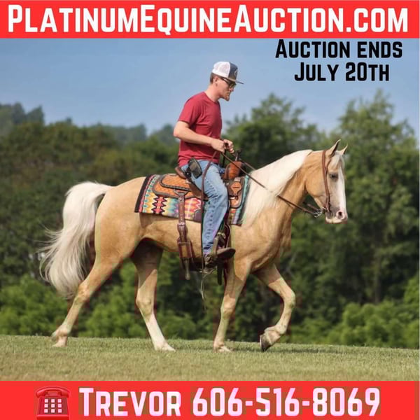 ONLINE AUCTION Place your bids at www.PlatinumEquineAuction.com Starting Bid $3500 Auction ends July 20th 2025 Need a new saddle? Check out White Rock Saddles on our website or Facebook Sooner is an eye-catching stout built, Golden Palomino gelding with a blaze face! He is a Tennessee Walking Horse standing around 14.3hh and he is 4 years old. Sooner has all the experience anyone could ask for but is young enough to do it all again! From field trials to coon hunting at night to just cruising the trails, he can handle it all! Sooner is a super fun horse to ride as he glides along effortless! He has that true 4-beat gait that is smooth for any rider at all speeds. He has been ridden in several states, from Tennessee to Indiana. He has seen everything imaginable and handles everything in stride! He has been exposed to all kinds of wildlife, such as deer or turkey, or other animals like cows or dogs, and will go anywhere that he is asked to. He has ridden many miles in the mountains of Eastern Kentucky and encountered every obstacle possible on the trail. He will go up or down even the steepest slopes, across deep creeks, over downed trees, and all rough terrain while still being sure-footed. He has been ridden in traffic and is very traffic-safe around cars, semis, logs, and dump trucks. If you are looking to blaze a trail but want to do it safely and steadily… Sooner is the horse for you! Feel free to call Trevor Patrick 606-516-8069 with any questions, to make a Buy It Now Offer or to schedule a time to come see him in person. ONLINE AUCTION Place your bids at www.PlatinumEquineAuction.com Starting Bid $3500 Auction ends July 20th 2025 Need a new saddle? Check out White Rock Saddles on our website or Facebook