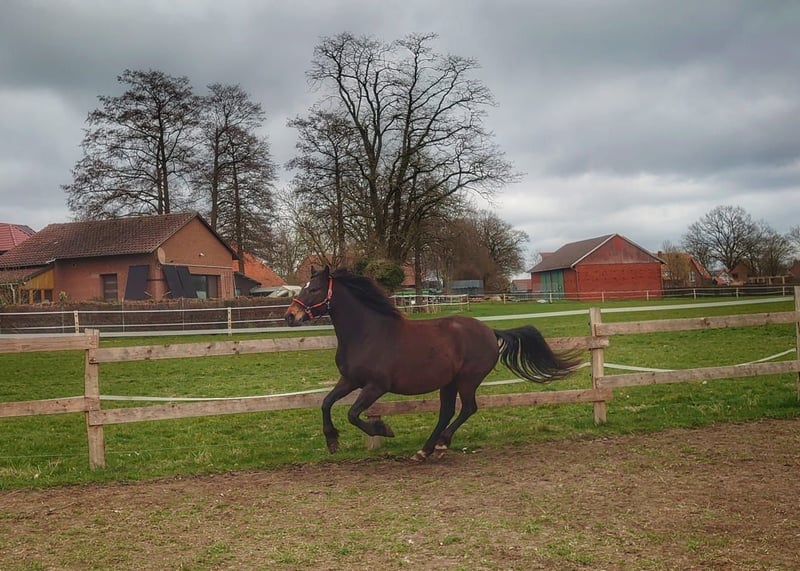 Sepia Libertas Geboren Mai 2019, Stockmaß 1,53m V: Edalar of Independence M: Samira Libertas Braun mit Sichelstern und hinten "weißen Söckchen" Sepia ist eine aufmerksame, nette Stute, die dem Menschen sehr zugetan und freundlich gegenüber ist. Im Herbst 2023 war sie in Beritt und kennt die Grundgangarten unterm Reiter. Doppellongenarbeit, Ausritte, Longieren sowie Schrecktraining und Bodenarbeit sind ihr ebenfalls bekannt. Typisch Knabstrupper ist sie für vieles zu begeistern, hat aber auch gern Abwechslung in ihrem Programm. Sepia lebt bei mir in einer Offenstallherde, kennt aber auch Boxenhaltung mit stundenweisem Weide-/Paddockgang. In der Herde zeigt sie sich als souveräne, faire Chefin ohne biestig oder unnötig dominant zu sein. Im November 2019 zog Sepia als Absetzer bei mir ein und hatte seither keinerlei Krankheiten. Sie wird 3x jährlich entwurmt, bekommt alle 7-8 Wochen eine Pediküre vom Schmied und ist geimpft gegen Tetanus, Influenza und EHV. Aufgrund ihrer Abstammung ist Sepia sehr interessant für die Zucht, macht durch ihre tollen, schwungvollen Bewegungen aber auch jedem Dressurcrack unterm Sattel Konkurrenz. Fohlen hatte sie bisher noch keine, wurde auch noch nicht gedeckt oder besamt. Schweren Herzens suche ich nun einen neuen Menschen für sie. Leider habe ich zu wenig Zeit für die Anzahl meiner Pferde und sie fällt oft "hinten runter", was sie einfach nicht verdient hat. Hat sie "ihren Menschen" erstmal ins Herz geschlossen, kommt sie einem auf dem Paddock entgegen oder steht schon am Tor, sobald sie das Auto hört. Falls sich kein passender Mensch für diese tolle, großherzige und liebevolle Stute findet, bleibt sie bei mir. Ich behalte mir vor, den neuen Stall vorab zu besichtigen und mir ein genaues Bild zu machen. Ebenso sind mehrere Kennenlerntermine für mich verpflichtend, da ich wirklich sichergehen möchte, dass alles passt und sie nicht zum Wanderpokal wird. Bei Fragen schreibt mich gern an. Preis ist verhandelbar, aber der Qualität entsprechend.