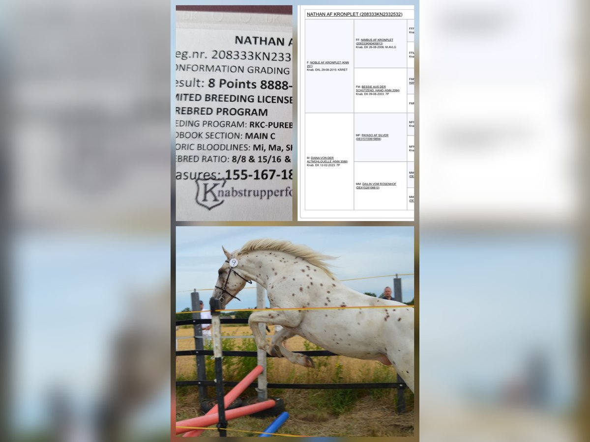 Nathan af Kronplet for Sale! Original Knabstrupper stallion with no foreign bloodlines. He will be three years old in May. Currently measured at 15.7 hh. Nathan is very people-oriented, intelligent, and eager to please. He is confident, calm, yet also sensitive and delicate in handling. He was awarded an 8 at his licensing, which speaks to his quality. A dream for any rider seeking a true partner for life and a special gem. Price on request. Pictures by Marianne Schwöbel.