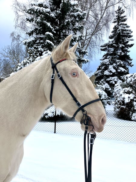 Roya fällt gleich doppelt auf: Wegen ihres harmonischen, barocken Körperbaus mit außergewöhnlichem Ramskopf und wegen ihrer seltenen Perlino-Farbe mit kleinem Stern auf der Stirn und blauen Augen. Da sie nicht nur optisch, sondern auch charakterlich etwas Besonderes ist, sucht sie ihren Menschen - der sie so nimmt, wie sie ist, mit ihrem enormen Potenzial und ihren Special effects. Vorneweg: Cruzado, 1.62 m Stockmaß, im Januar 2026 11 Jahre alt geworden. Robust, sehr gute Hufqualität, schmiede - und verladefromm, nervenstark, geht entspannt allein ins Gelände. In der Reitbahn Seitengänge in Schritt und Trab. Steht in gemischter Herde, ranghoch. Sucht sich eine Stute als beste Freundin, die sie mitunter eifersüchtig bewacht. Nun zu den Special effects … als ich Roya kaufte (vor 3 Jahren) blockierte sie beim Reiten vollständig. Inzwischen lässt sie sich schön reiten, lässt sich eher treiben als zu rennen, fragt aber bei jedem neuen Reiter nach, ob er es wirklich ernst meint. Wenn sie jemanden nicht ernst nimmt, schaltet sie ab und wird extrem träge (hat man einmal die richtigen Knöpfe gefunden, ist Vorwärts kein Problem). Daher ist sie für meinen Reitunterricht leider nicht geeignet. Unter Druck (Turnier, Prüfungssituationen) blockiert sie ebenfalls und zieht sich in Langsamkeit zurück. Möglicherweise legt sich das, wenn sie ihren Menschen hat und mit Geduld an solche Situationen herangeführt wird - m.E. wurde sie beim Einreiten überfordert, weshalb sie anfangs häufig dissoziierte. Aktuell sehe ich sie eher als entspanntes Ausreitpferd, das auch mal in der Bahn arbeitet - mit ausschließlicher Dressurarbeit wird sie nicht glücklich. Handarbeit mag und kennt sie. Roya ist ein tolles Pferd - ich könnte sie mir in der WE vorstellen - aber sie braucht jemanden, der so viel Ego hat wie sie :) Kontakt bitte per WhatsApp / SMS. Danke! Kein Verkauf auf Raten, kein Zurverfügungstellen. Kein Probereiten beim ersten Besuch (sorry, sonst müsste ich auch damit anfangen, Geld zu nehmen fürs Korrekturreiten danach…)