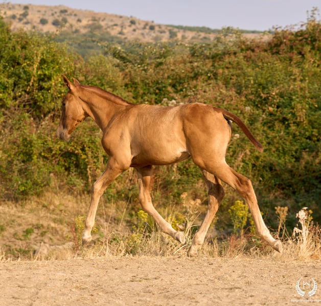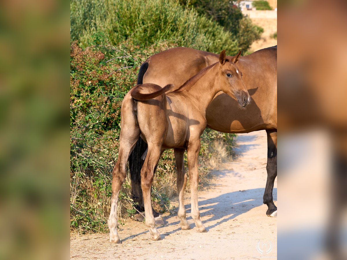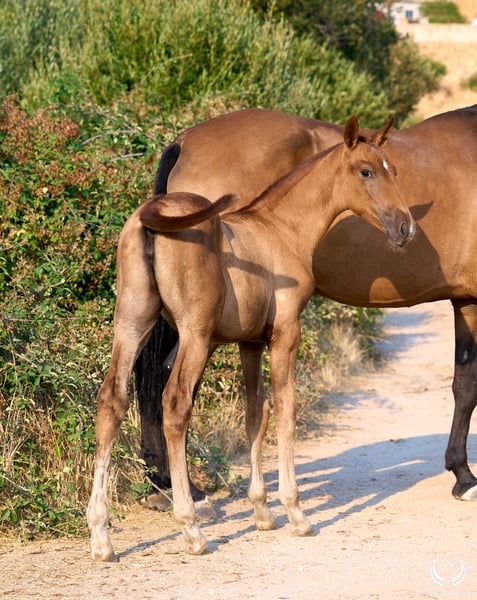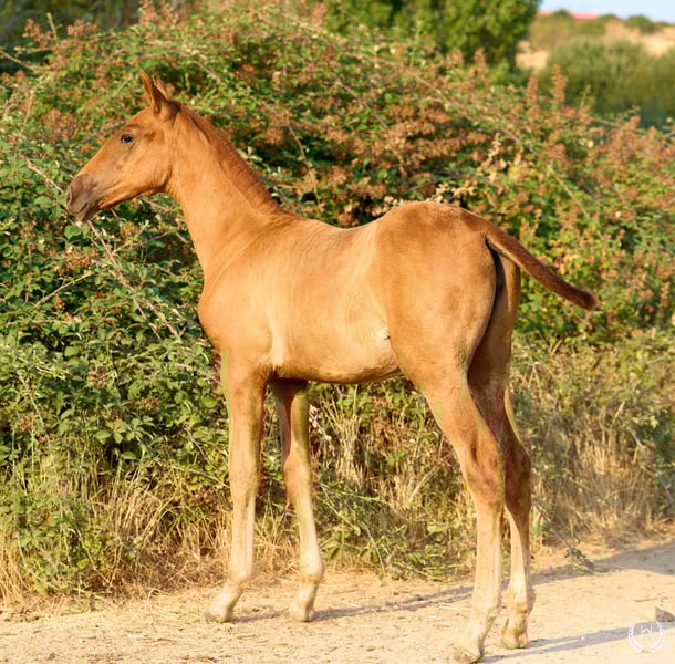 🏇 Ambar is an impressive Pura Raza Española (PRE) filly with a chestnut coat (ee), a white star on her forehead and another on the upper lip, with exceptional genetics. Registered with ANCCE, she is homozygous for the extension gene (ee), the well-known “little e”. Red mane and tail. 📆 Born on 27 May 2025 🧬 Outstanding PRE genetics: ♀️ Dam: Triana CCCXVI, a 1.70 m PRE mare, daughter of the great Deimos (1.80 m) from the prestigious Hnos. Tejedor Fdez. stud. Deimos is a grandson of Educado X (Hnos. Salvador Guardiola Fantoni), a Qualified, Improving and Elite Stallion, one of the most influential names in modern PRE breeding. ♂️ Sire: Pellon – Yeguada Militar “Pellon” is a black stallion born in 2016 at the Military Breeding Centre of Écija, standing 1.64 m tall. He stands out for his beauty, nobility and exceptional willingness to work, qualities he consistently passes on to his offspring. His genetics are impeccable: on the sire line he descends from Velero XI, one of the few stallions recognised by ANCCE as a Qualified Breeding Stallion and Young Recommended Breeder, a reference in sport; on the dam line he descends from Cepellon and Lego, as well as Lebrijano III and Bizarro XIV, some of the most important reproducers of the Yeguada Militar. Pellon has over 58 registered offspring, consistently producing elegant, functional and very expressive foals with top-level morphology and temperament. 🏆 Sporting potential and exceptional genetics: Ambar has everything to become an outstanding filly: impeccable breed morphology, convex profile and head, wide, functional and powerful movements, an exotic and highly valued coat, and a sweet, very easy temperament. Her pedigree guarantees quality and a strong future. 🩺 Health guaranteed: Any veterinary examination is accepted. Filly raised in freedom, perfectly socialised and well balanced within the herd. ✈️ National and international transport: We work with the best specialised equine transport companies. Request your quotation with no obligation.