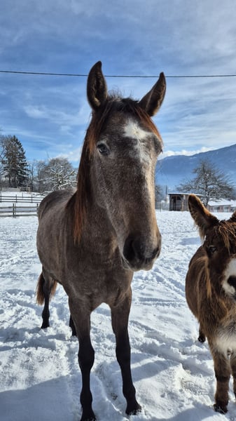 Unsre Sophie ist eine Andalusier- Stute im Jänner 2024 geboren & ca. 155cm groß Farbe: Braune (span. Pass: Bayo) Sie ist kerngesund - hatte damals einen Nabelbruch, dieser wurde opriert & macht keinerlei Probleme! Sie hat einen traumhaften Charakter, ist immer bei der Sache, lernt irrsinnig schnell & gerne & ist für absolut alles zu haben! Sie ist natürlich halfterführig, Hufe geben geht auf Kommando, longieren macht sie schon total toll mit. Sophie liebt Spaziergänge, wo sie auch mal herumtollen darf, ist dabei aber immer händelbar! Sie steckt ihre junge Energie auch sehr gerne in kleine Denkaufgaben, wie spanischer Schritt, Spin, Lächeln oder Hinterhand- / Voderhandweichen. Sie ist für absolut jeden Spaß zu haben, leicht zu überzeugen & hatte auch schon einige Male den Longiergurt drauf. Sie ist sicher ein tolles Pferd für Menschen, die gerne Bodenarbeit Lektionen machen & dann weiters ein verlässliches Reitpferd haben wollen. Sie ist kein Notverkauf & wird auch nur in Hände abgegeben, wo es zu 100% passt. Nach einen persönlichen Kennenlernen von Pferd & Mensch können wir gerne weiteres Bespreche. Gerne eine WhatsApp/ Nachricht an 0650/5131579