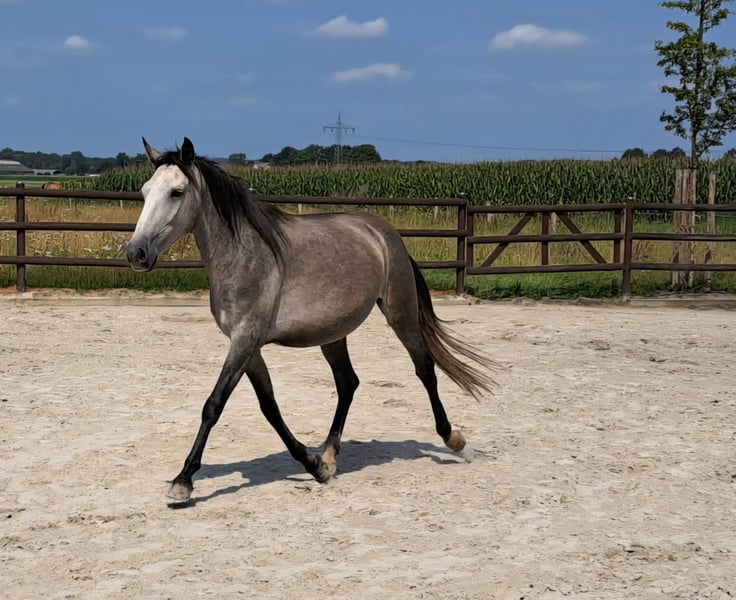 Caña, a nearly 4-year-old typical Andalusian mare. She was born with us and has always grown up in a herd and on large pastures. Still unbroken, she gives her hooves and is very well-behaved and uncomplicated to handle. Final height approximately 155 cm +-. She can either stay for further training or move directly to her new home. Serious inquiries are welcome!!