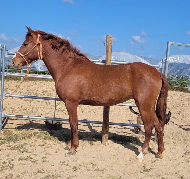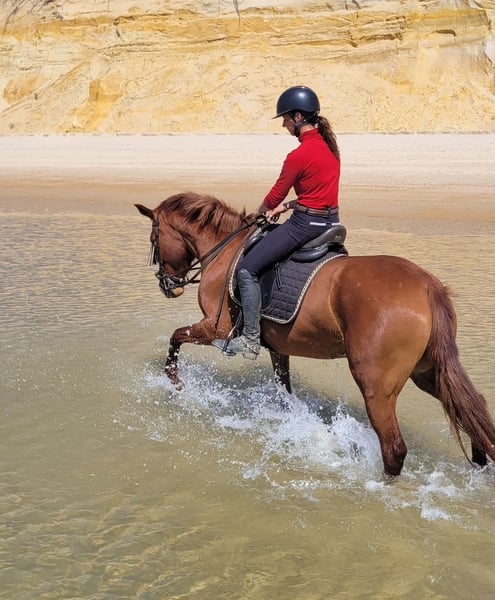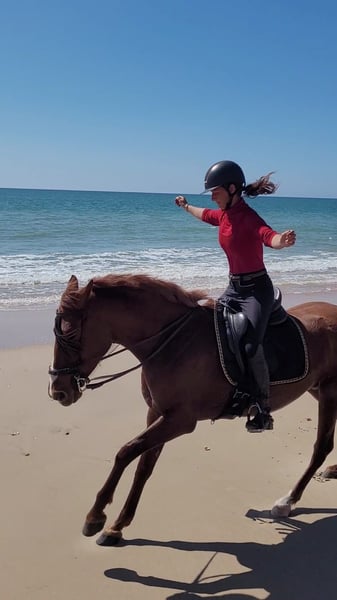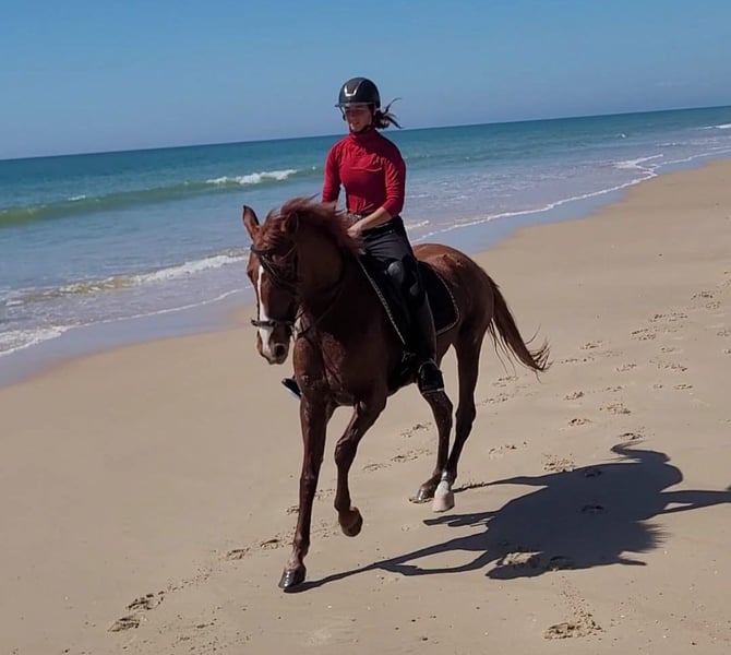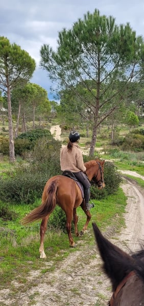 Rasquiña ist ein echter Allrounder. Obwohl sie erst seit September 2025 gearbeitet wird ist sie bereits ein richtiges Verlasspferd. Sie ist im täglichen Umgang ruhig, verschmust und gut erzogen. Auch in fremder Umgebung ist sie absolut entspannt. Sie ist regelmäßige Ausflüge und Anhängerfahren gewohnt. Auch Straßenverkehr mit vielen Autos, Pferden und Kutschen bringt sie nicht aus der Ruhe. Beim Reiten ist sie sehr fein an den Hilfen und hört ihrem Reiter gut zu. Sie möchte immer gefallen und ist für ein junges Pferd sehr gut ausbalanciert und einfach zu reiten. Sie geht fleißig vorwärts, ohne dabei zu rennen. Dinge wie Außengalopp und erste Seitengänge fallen ihr leicht. Im Gelände geht sie problemlos vorne oder hinten oder auch alleine. Sie ist immer mutig und gelassen. In der Herde ist sie eher rangniedrig und kommt problemlos mit allen anderen Pferden aus. Ich kann mir Rasquiña sehr gut bei jemandem vorstellen, der das ein oder andere Abenteuer mit ihr erleben möchte und einfach einen zuverlässigen Partner sucht. Auch für Working Equitation wäre sie sicherlich gut geeignet. Aufgrund von Alter und Ausbildungsstand wird sie natürlich nicht als reines Anfängerpferd verkauft. Gerne könnte sie auch noch zur weiteren Ausbildung hier bleiben.