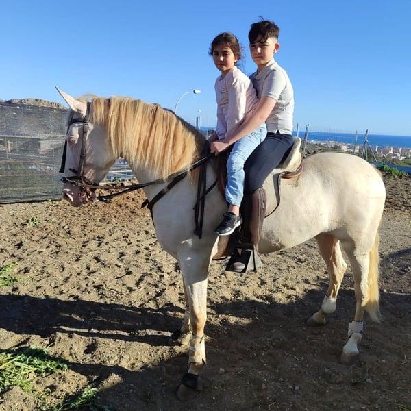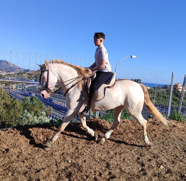Breed: SPANISH x LUSITANO Age: 4 YEARS Height: 1.59 EXACT (measured with a stick) Sex: FEMALE Documentation: PASSPORT Type of training: WALK, TROT, AND CANTER. Veterinary check: YES SUITABLE FOR CHILDREN AND BEGINNERS. Contact: +34 613 34 99 00 WhatsApp: YES