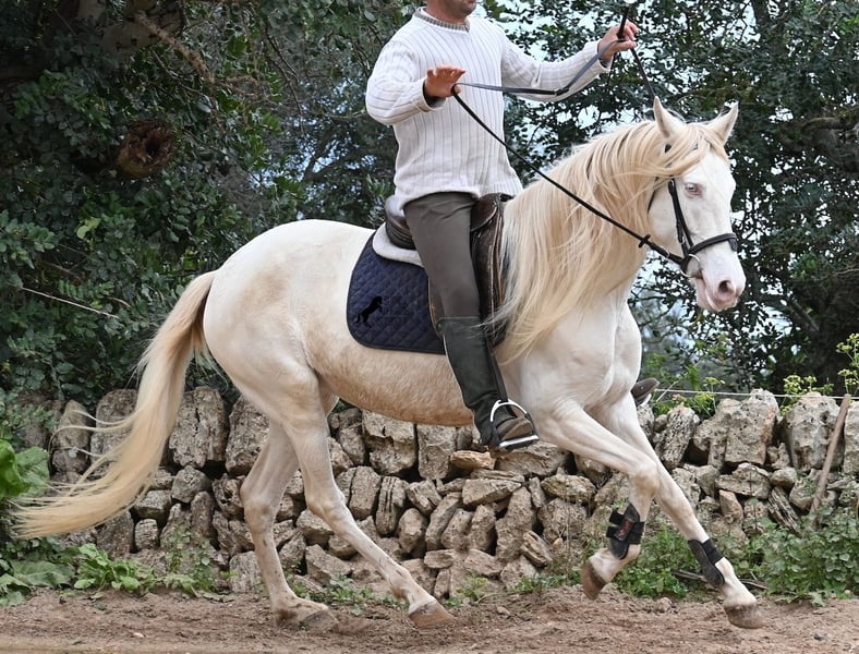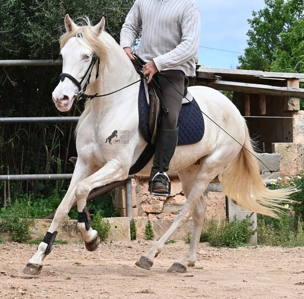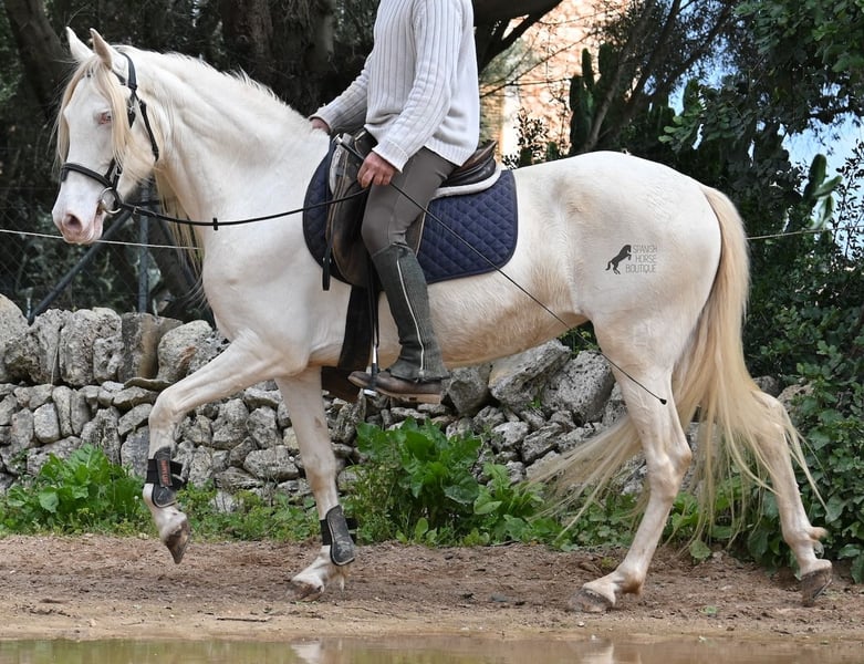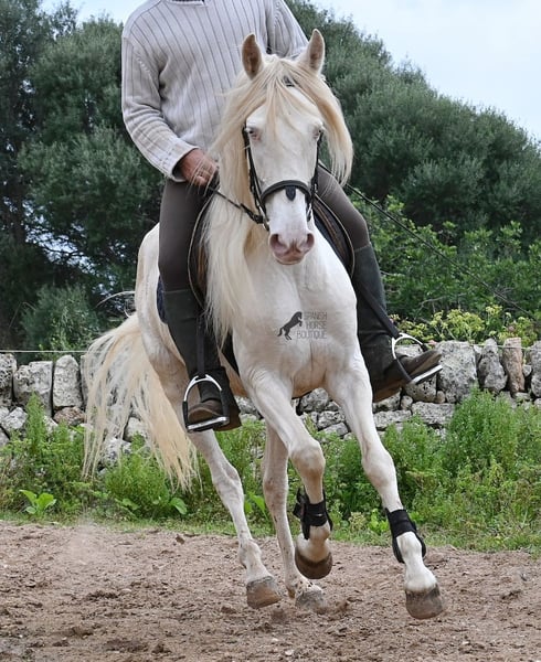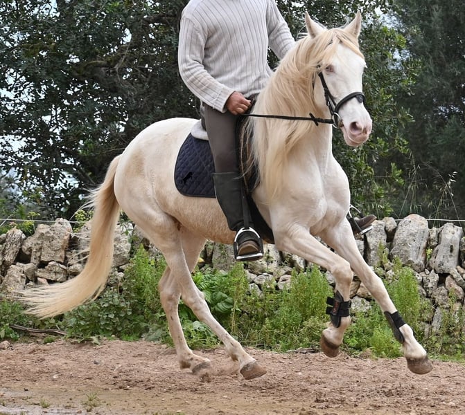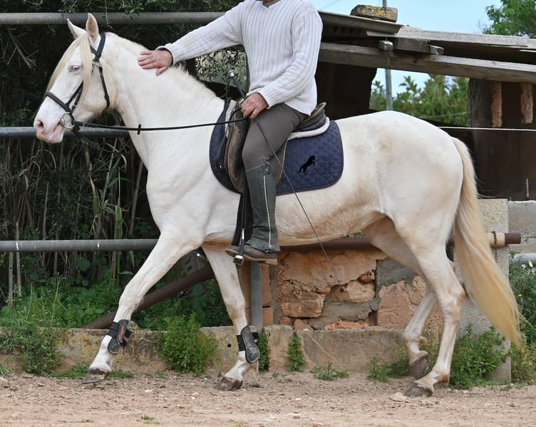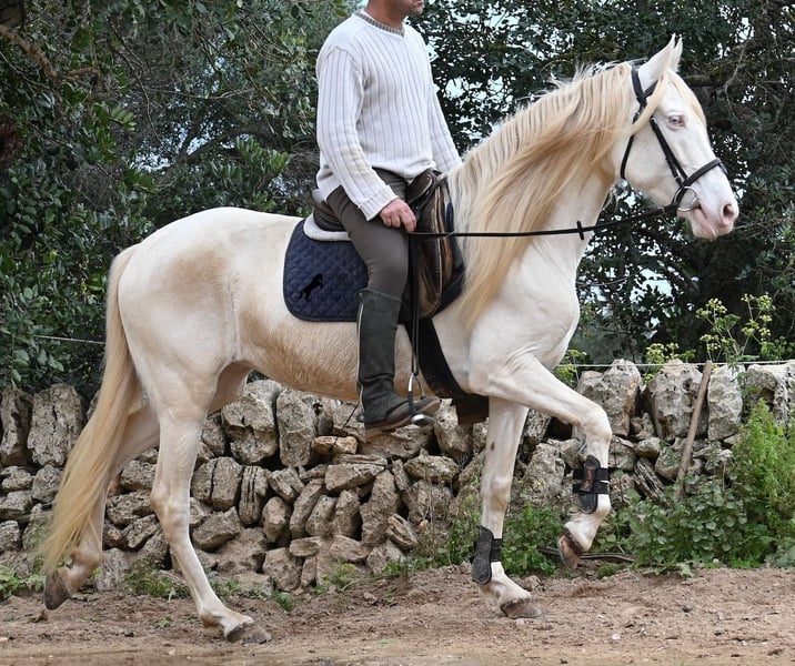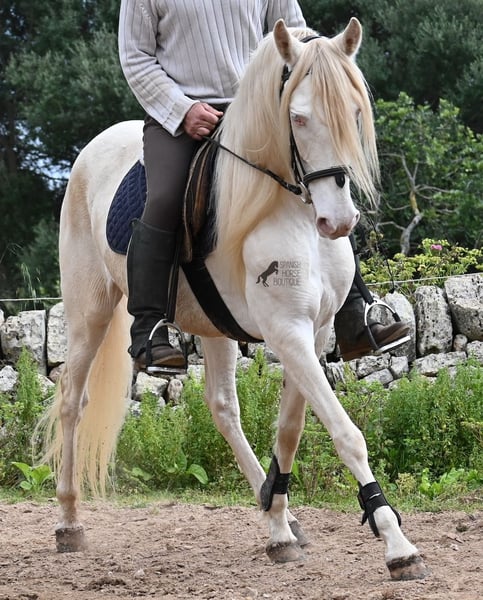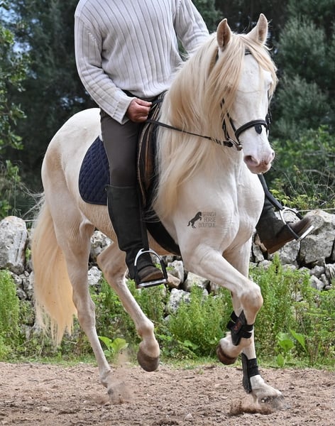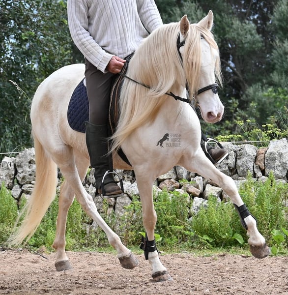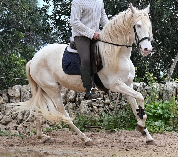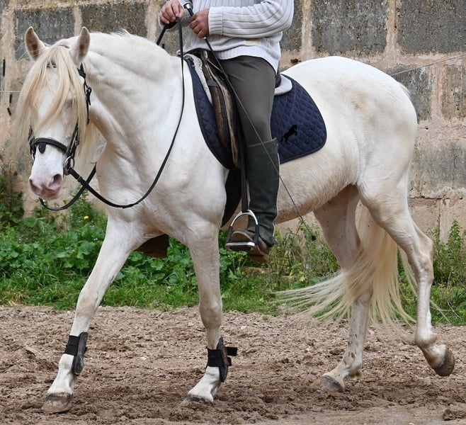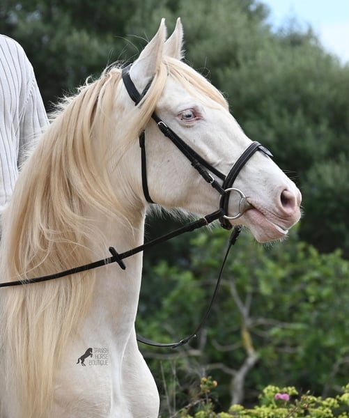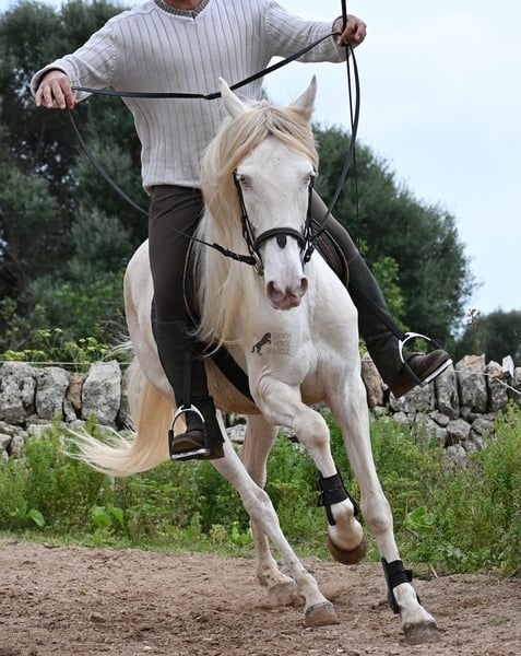 Diese 2020 geborene Andalusierstute (PRE Eltern, sie hat einen Equidenpass) ist ein wahres Juwel. Ihr traumhaftes Aussehen mit den stechend blauen Augen und der langen Mähne, zusammen mit ihrem femininen Exterieur, machen sie zu einer wahren Augenweide. Doch sie ist so viel mehr, als nur schön! Seit Dezember 2019 ist sie erst unter dem Sattel und stand bis dahin wie ein Wildpferd in der Stutenherde. Diese lange Zeit, die sie hatte um einfach ein soziales Pferd zu sein, hat sie auch im Kopf reifen lassen. Denn sie lernt unfassbar schnell und hat sich in kürzester Zeit sehr an ihren Reiter gebunden. Mit nur 153cm Stockmaß ist sie nur leider zu klein für ihn, um für immer zu bleiben. So wird für sie ein Zuhause gesucht, wo man so mit ihr umgeht, wie sie es gewohnt ist- mit viel Liebe, Zuwendung und schonendem Training. Sie wurde schön an der Longe bemuskelt, bevor es unter den Reiter ging, das sieht man besonders an der tollen Halsung, die auch mit dem Gewicht der langen Mähne, stark ist und nicht zur Seite neigt. Es werden ihr immer wieder Momente am langen Zügel angeboten und nichts wird mit hast gemacht. Am Reitplatz war sie keine 5x unterm Reiter, es geht immer ins Gelände, inklusive Baden im Meer und bis zu 3h unterwegs, wo sie einfach unermüdlich ist! Unfassbar ist, wie extrem mutig und unerschrocken sie ist. Ich habe sogar ein Video, wo eine riesige Baumaschine an ihr vorbeifährt und sie stolziert unerschrocken vorbei, als wäre nichts! Radfahrer und Autos von vorne und von hinten- sie marschiert! Und das auch mit Energie, denn sie hat viel Tatendrang und man muss sie an die Ruhe erinnern, denn sie will einfach vorwärts. Wobei sie immer sanft ist, selbst wenn man im Galopp die Zügel komplett loslässt. Für Geländereiter ist sie jetzt schon eine ideale Partnerin, wenn man ein wunderschönes Pferd im Sonderlook mit großem Herzen und unermüdlicher Lust zu marschieren sucht. Für alle die auch gerne im Viereck unterwegs sind, müsste sie noch etwas mehr in der Biegung und Anlehnung gearbeitet werden, aber mit ihrem Charakter, wird sie auch das schnell lernen. Die Zähne wurden vor Kurzem gemacht, sie geht vorne beschlagen und hinten barhuf und ihren Alltag verbringt sie im Offenstall mit anderen Stuten. Ein fabelhaftes Pferd mit viel Potenzial zu einem mehr als fairen Preis! Videos und Abstammung gerne auf Anfrage. Ihr Standort ist Mallorca. Gerne organisiere ich vor Ort eine AKU, Transport oder auch ihre Reise, sollten Sie persönlich zum Anschauen kommen. Details dazu gerne auf meiner Seite oder im Gespräch. Saludos aus Spanien