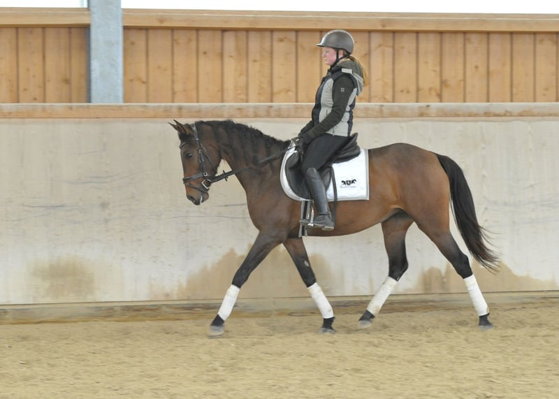 Elegante rittige braune Stute, sehr gelehrig und zeigt sich in der täglichen Arbeit mit Einstellung und angenehmen Sitzkomfort, vermittelt sie ein tolles Reitgefühl. Sie bietet ideale Voraussetzungen für den vielseitigen Einsatz für Freizeit, Halle, Dressur, sowie Geländeausritte. Sie kennt auch Straßenverkehr und Feria.